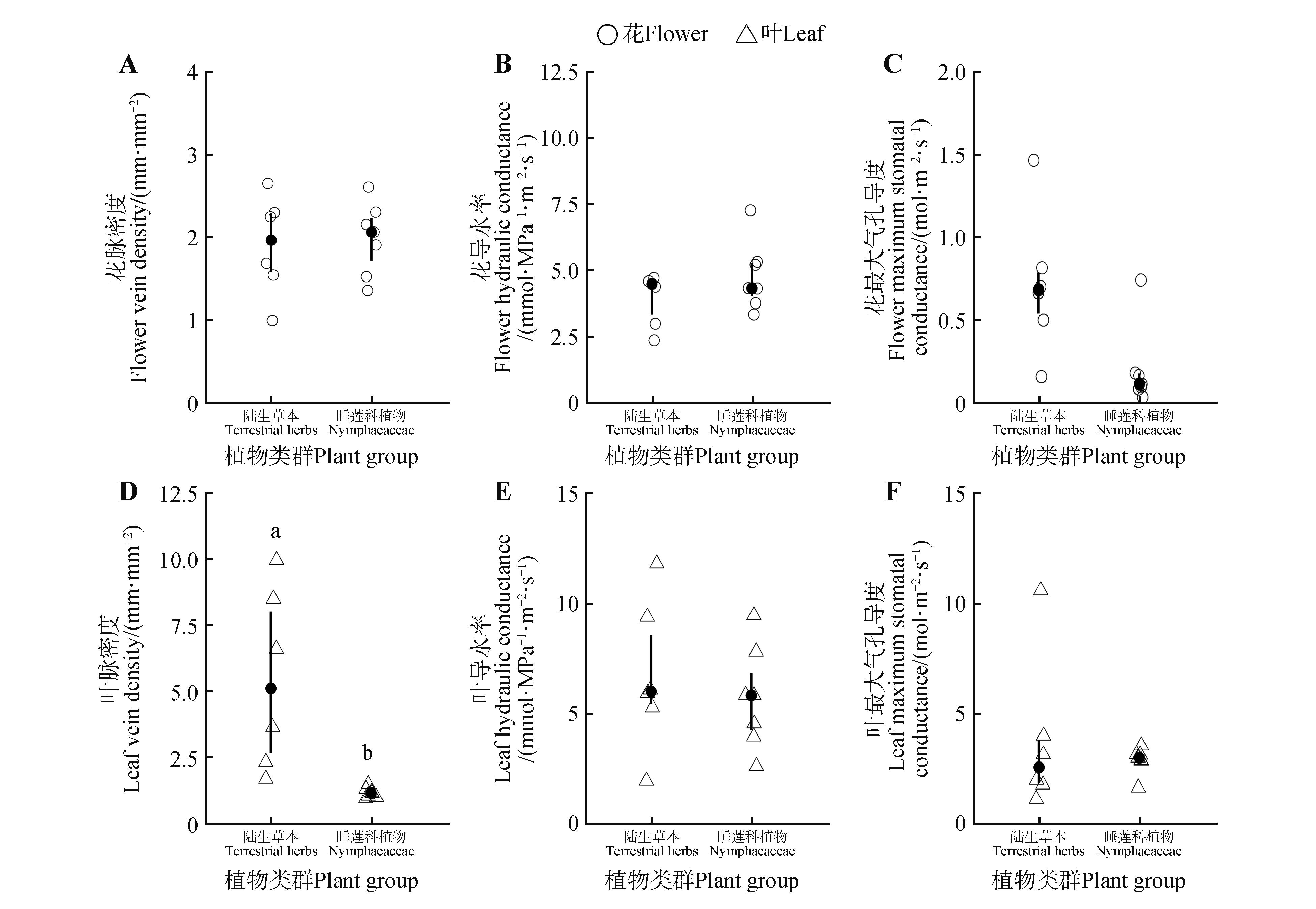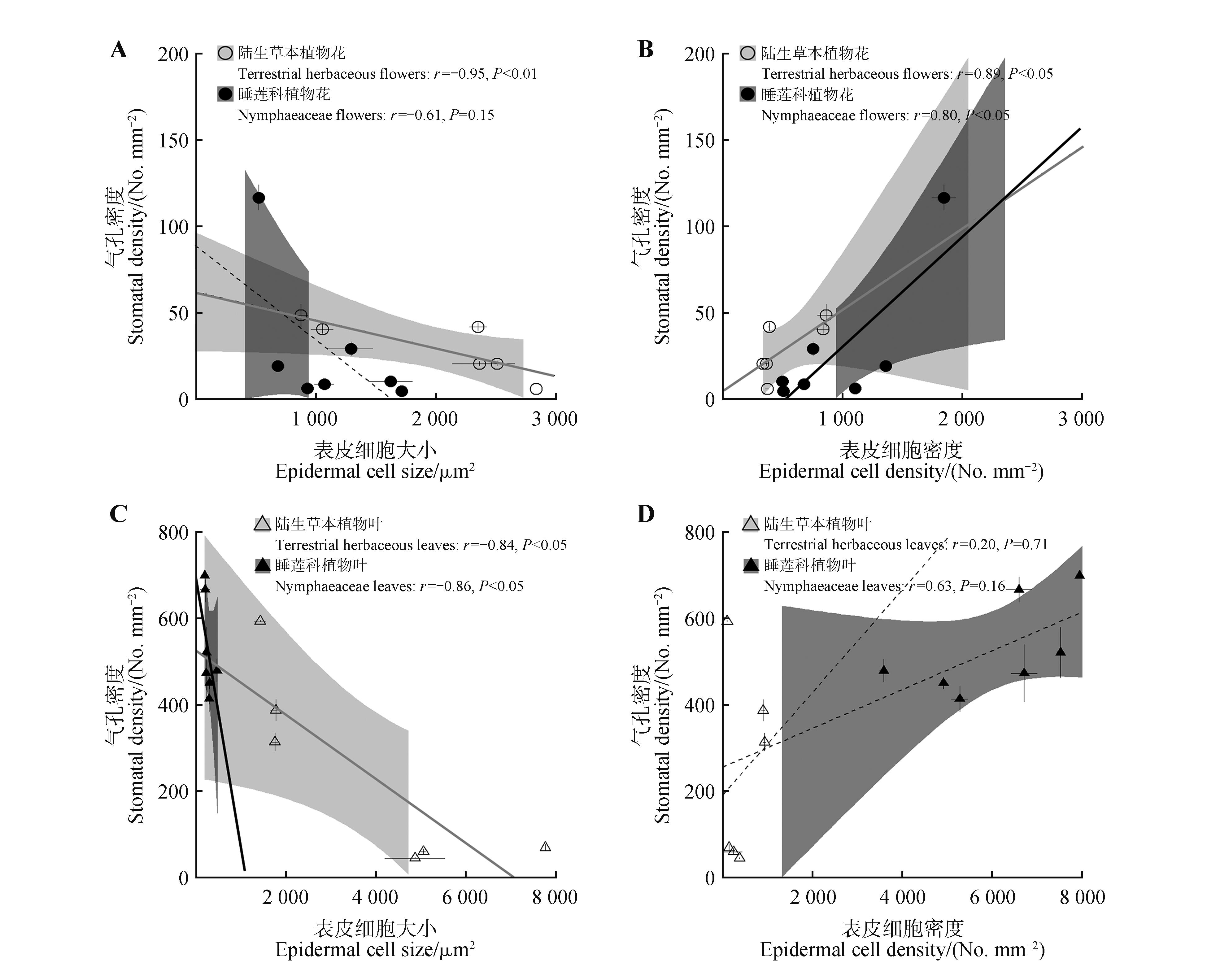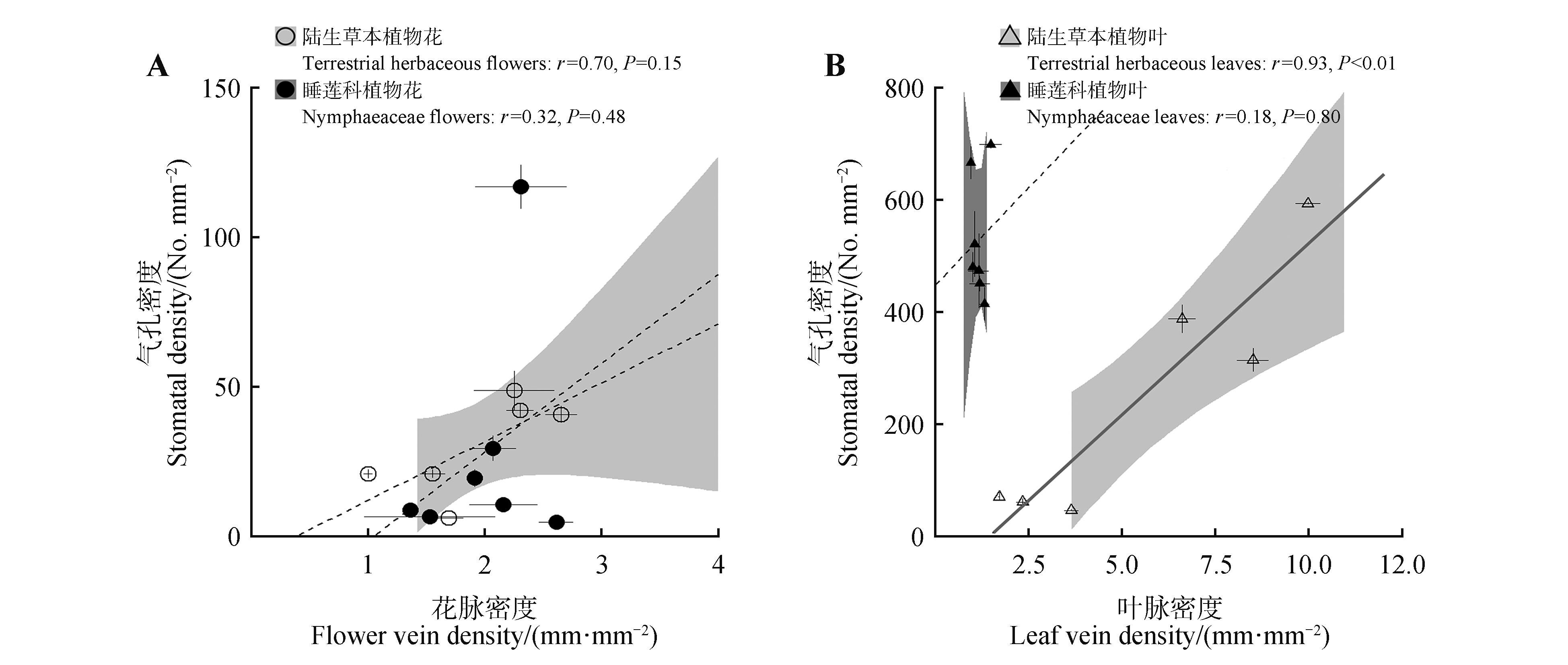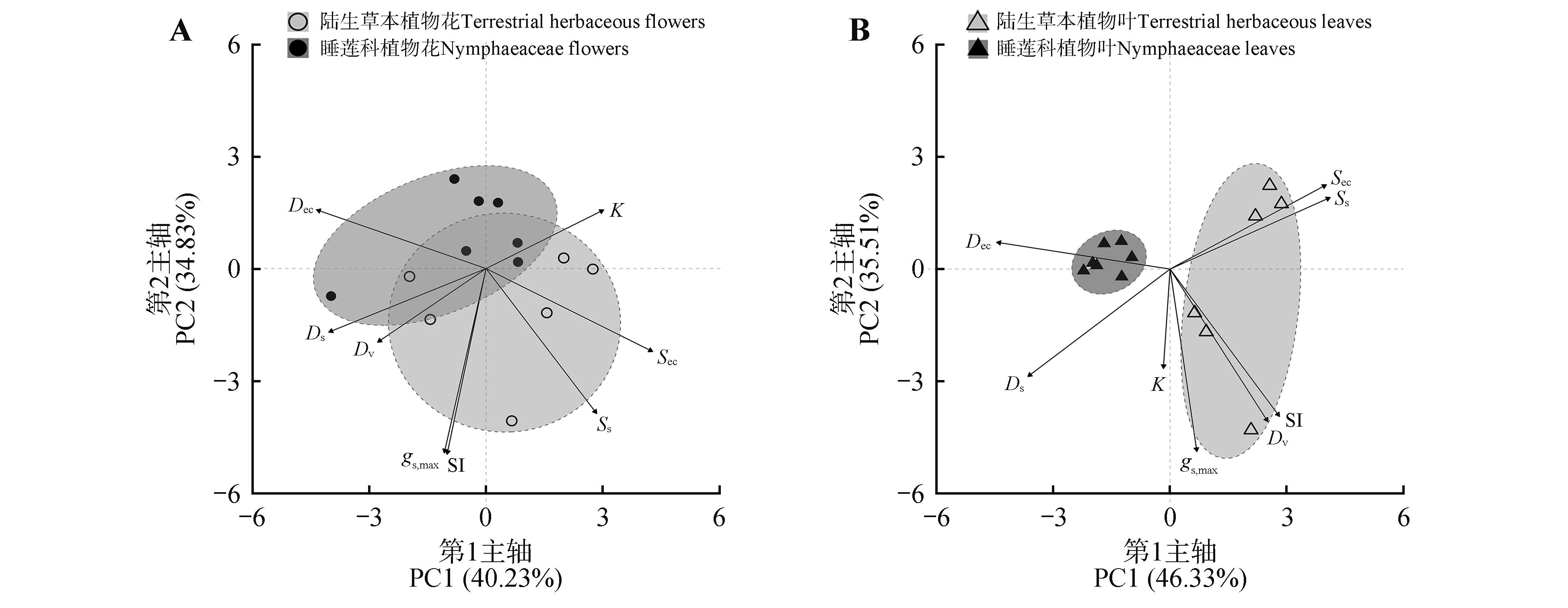 陆生被子植物主要通过叶脉与气孔的协调来平衡供耗水,表皮细胞在此过程中发挥重要作用。然而,在睡莲科(Nymphaeaceae)植物中相关研究非常有限。该研究以7种睡莲科植物、6种陆生草本植物为对象,通过量化分析花、叶的解剖特征,探讨睡莲科种内及2类群间花、叶性状差异。结果表明:睡莲科植物花比叶具更大的气孔、表皮细胞及更高的脉密度,叶表现出更高的气孔密度、表皮细胞密度及气孔指数。睡莲科植物花的解剖性状与陆生草本植物相似,叶的表皮细胞密度、气孔密度显著高于陆生草本植物叶,气孔大小、表皮细胞大小、叶脉密度、气孔指数显著低于陆生草本植物叶。睡莲科植物花气孔密度与表皮细胞大小、花脉密度均无关;叶中表皮细胞大小与气孔密度呈负相关,气孔密度与叶脉密度解耦。主成分分析表明,与陆生草本植物相比较,睡莲科植物花具有表皮细胞密度优势;叶性状区域完全分离,睡莲科植物叶具有表皮细胞密度和气孔密度优势。综上,睡莲科植物花因挺水特征表现出与陆生草本植物花相似的性状,叶片中气孔与脉之间的解耦反映了其对水生环境的适应性演化。上述结果为研究水生植物水分利用特征及环境适应机制提供了重要依据。