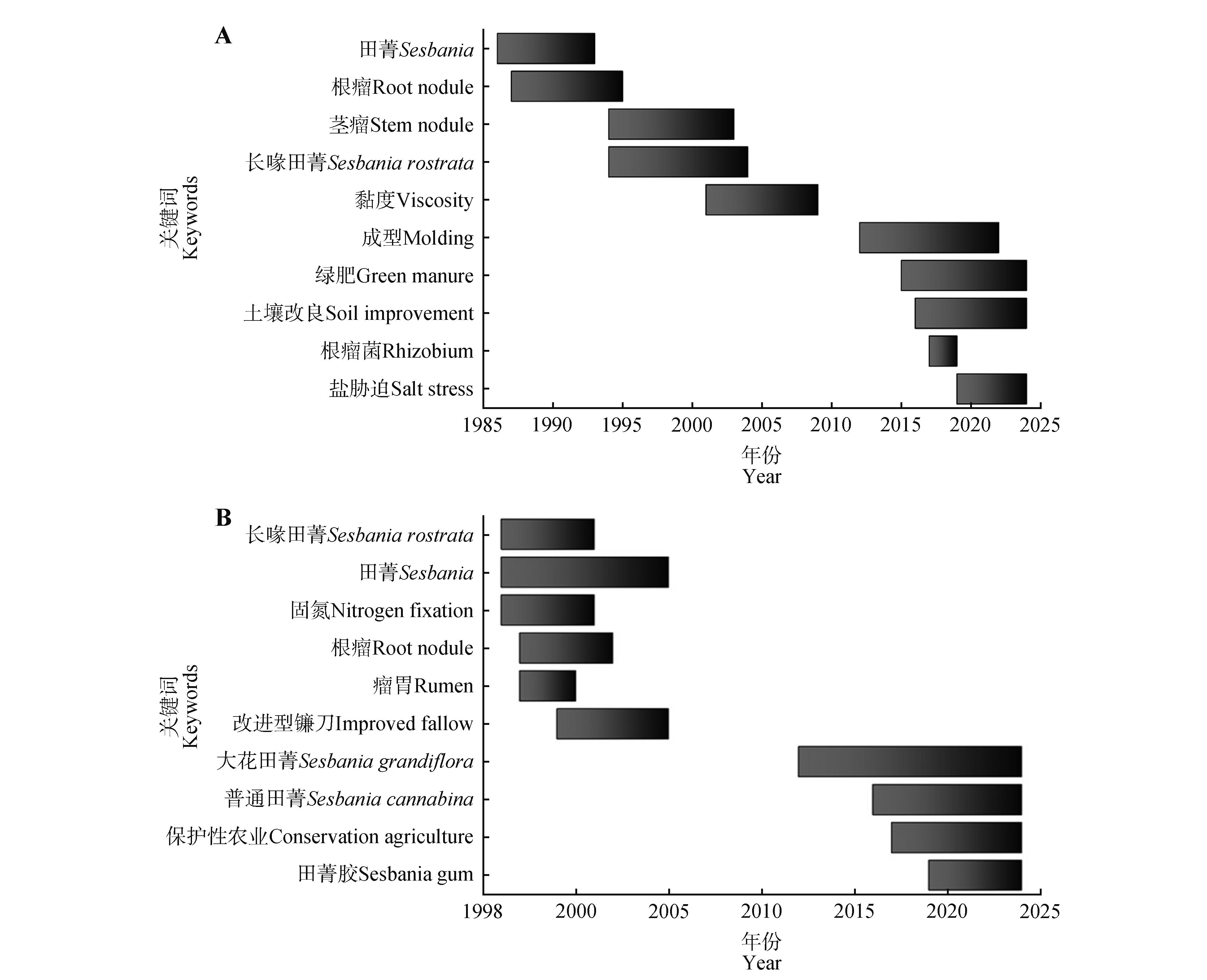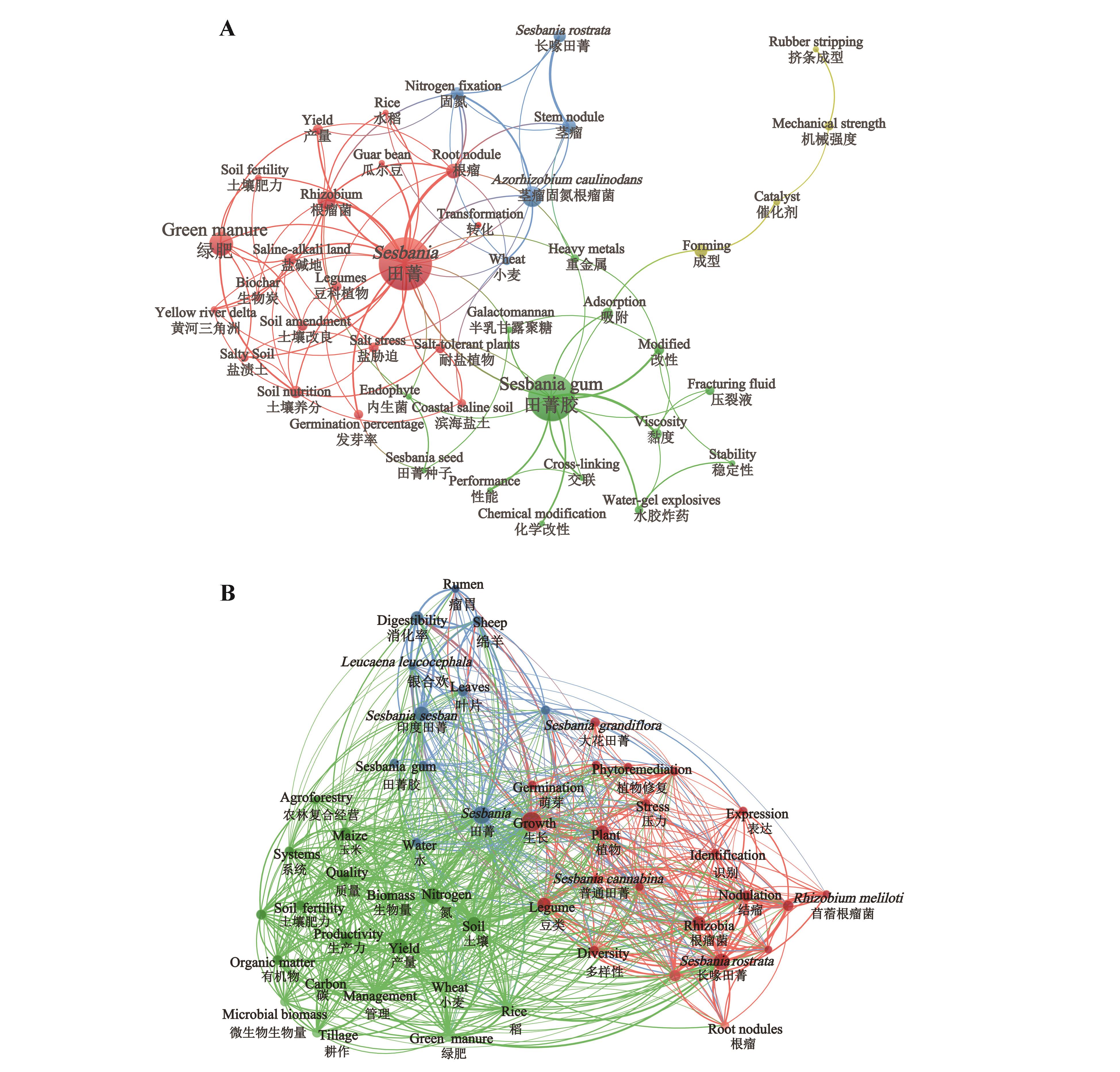 To systematically understand the current research status of Sesbania in China and abroad, this paper utilized bibliometric tools such as Citespace, VOSviewer, and HistCite to systematically analyze the relevant papers from the China National Knowledge Infrastructure(CNKI) search platform(1958—2024) and the Web of Science Core Collection database(1928—2024). Results indicated: (1)Global annual publication output on Sesbania research has shown an increasing trend, with Chinese contributions significantly increasing from 2016 to 2024. Both Chinese and English studies concentrated on the fields related to agricultural science, with key journals including Soil and Fertilizer Sciences in ChinaWeed Technology and Indian Journal of Agricultural Sciences, etc. Cui Yuanchen and Holsters M were the top contributors in Chinese and English publications, respectively. (2)The co-occurrence network of Sesbania keywords were mainly classified into five categories: symbiotic nitrogen fixation, agricultural green manure, livestock feeding, biological control, and sesbania gum. (3)Recent studies have increasingly focused on gene-level mechanisms in symbiotic nitrogen fixation, expanding the host range of rhizobia for nitrogen fixation of non-legumes has become one of the research hotspots. In saline-alkali soil remediation applications, microbial-mediated strategies to enhance salt tolerance for Sesbania have gained attention. Although there are more research papers published abroad in livestock feeding and biological control, China has achieved significant advancements in genetic transformation technologies for forage crops like Sesbania, with establishing corresponding gene-editing systems. Recent advances in sesbania gum research primarily focused on improving the modification processes to enhance its performance and application scope.