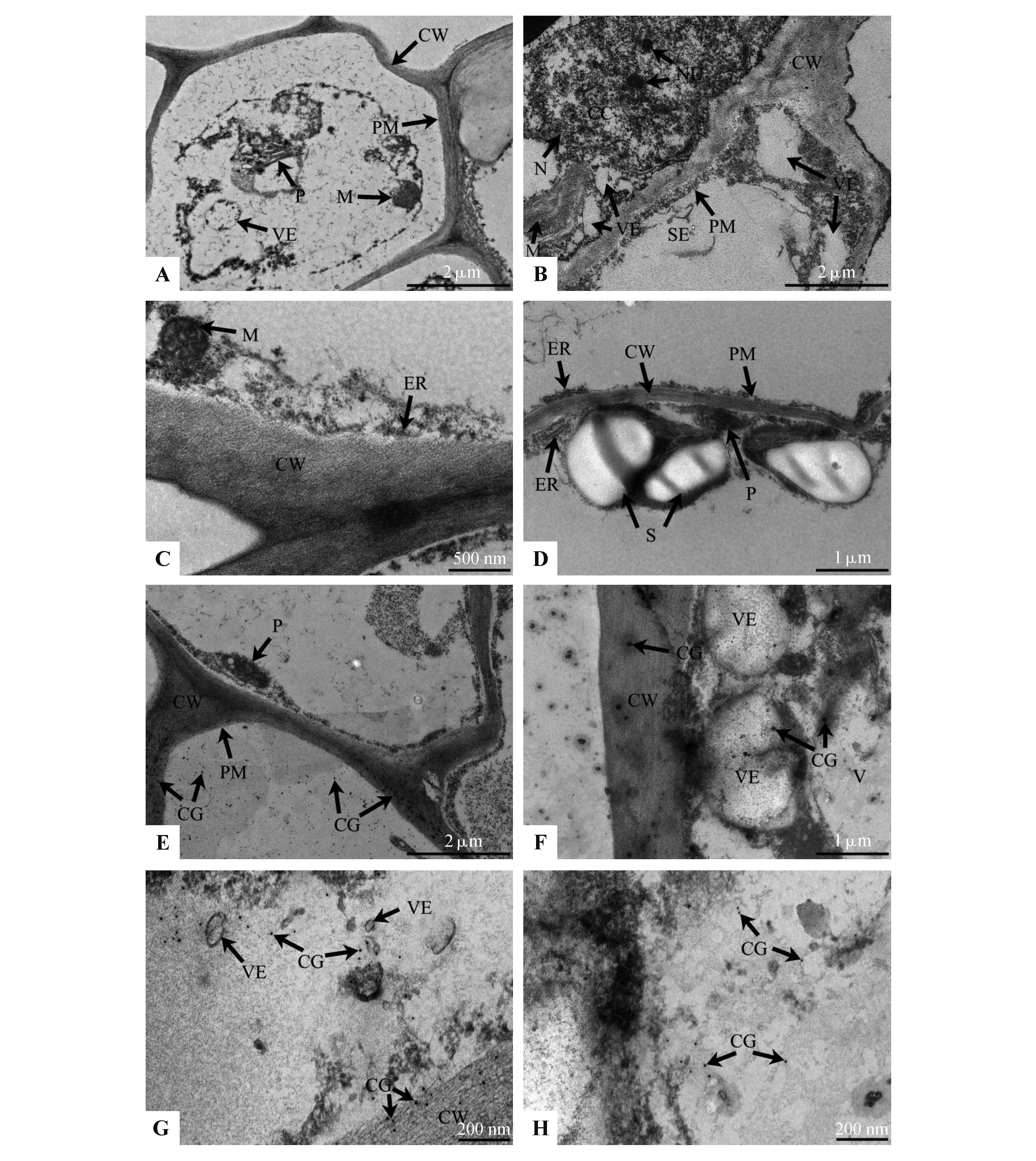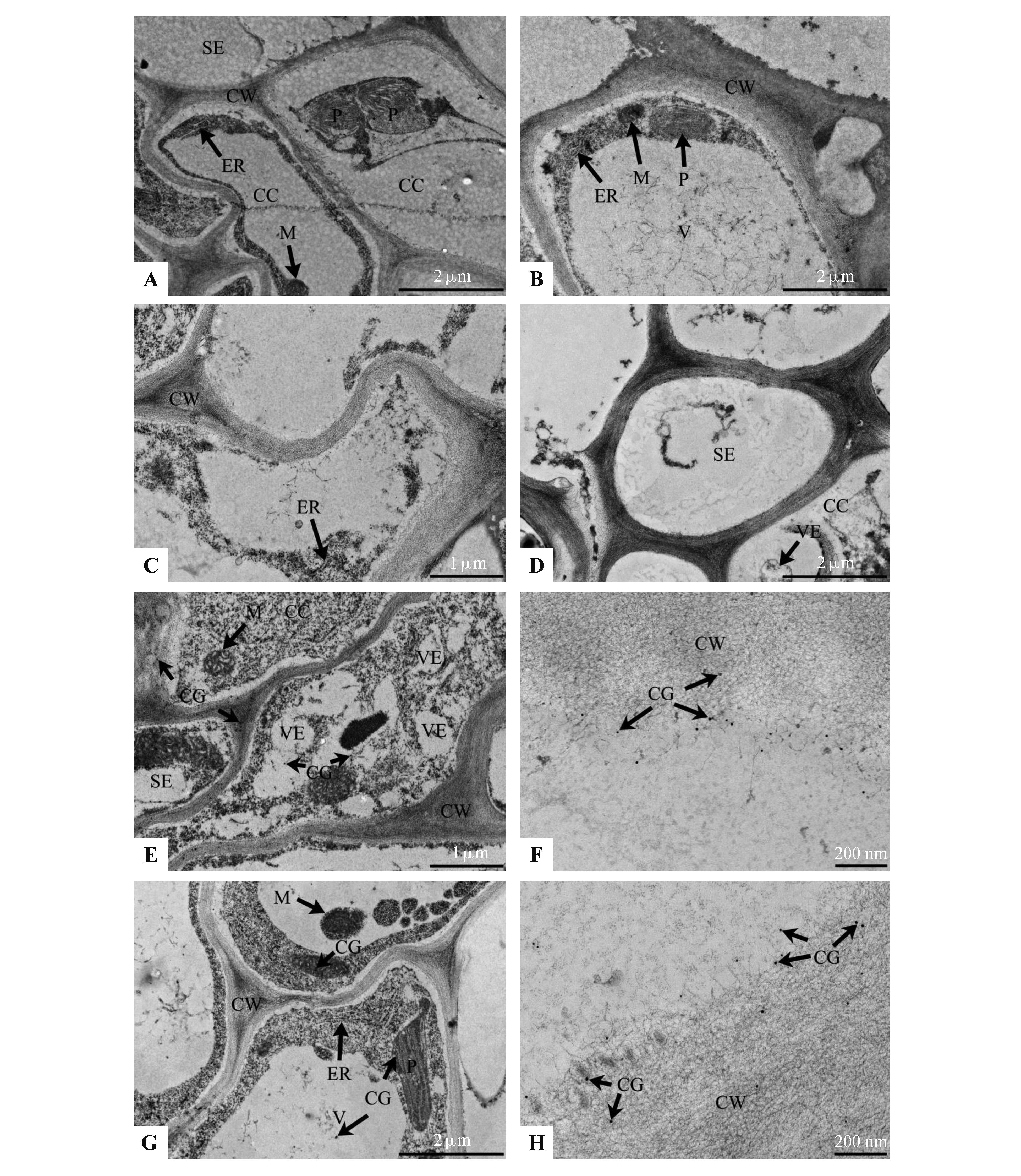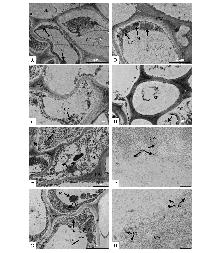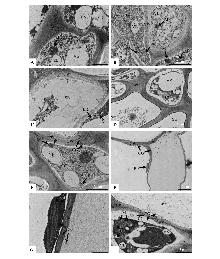 阿拉伯半乳糖蛋白(AGPs)在果实的成熟与软化中发挥重要作用,为了探讨灵武长枣(Ziziphus jujuba ‘Lingwu Changzao’)果实发育过程中AGPs的分布特征和动态变化规律,该研究使用单克隆抗体JIM13,采用胶体金免疫电镜技术,对4个不同发育时期灵武长枣果实超微结构特征及AGPs的免疫细胞分布进行分析。结果表明:使用10 nm胶体金颗粒对果实标记后,在膨大前期,韧皮部的薄壁细胞和离维管束较远的薄壁细胞内部和细胞壁上均分布有大量的胶体金颗粒,细胞内的液泡、质体等细胞器中也有胶体金颗粒的分布;在快速膨大期,筛管分子和离维管束较远的薄壁细胞的细胞壁及细胞内部均分布有大量的胶体金颗粒;在着色期,维管束韧皮部的筛管、伴胞和薄壁细胞,以及离维管束较远的薄壁细胞的细胞壁及细胞内部胶体金颗粒的分布较少;在完熟期,维管束韧皮部的伴胞及离维管束较远的薄壁细胞在细胞壁上及靠近质膜部位分布有少量的胶体金颗粒,并且细胞内部的胶体金颗粒数量较少,在囊泡、线粒体、质体及中央大液泡上分布有零星的胶体金颗粒。研究认为,果实AGPs主要分布在细胞壁上、靠近质膜的区域、细胞内部及细胞器上;不同发育时期果实AGPs的分布存在一定的差异,在膨大前期和快速膨大期细胞壁及细胞内部AGPs分布较多,在着色期和完熟期细胞壁及细胞内部AGPs分布的数量较少。上述结果为揭示AGPs对果实品质的影响提供细胞学依据。