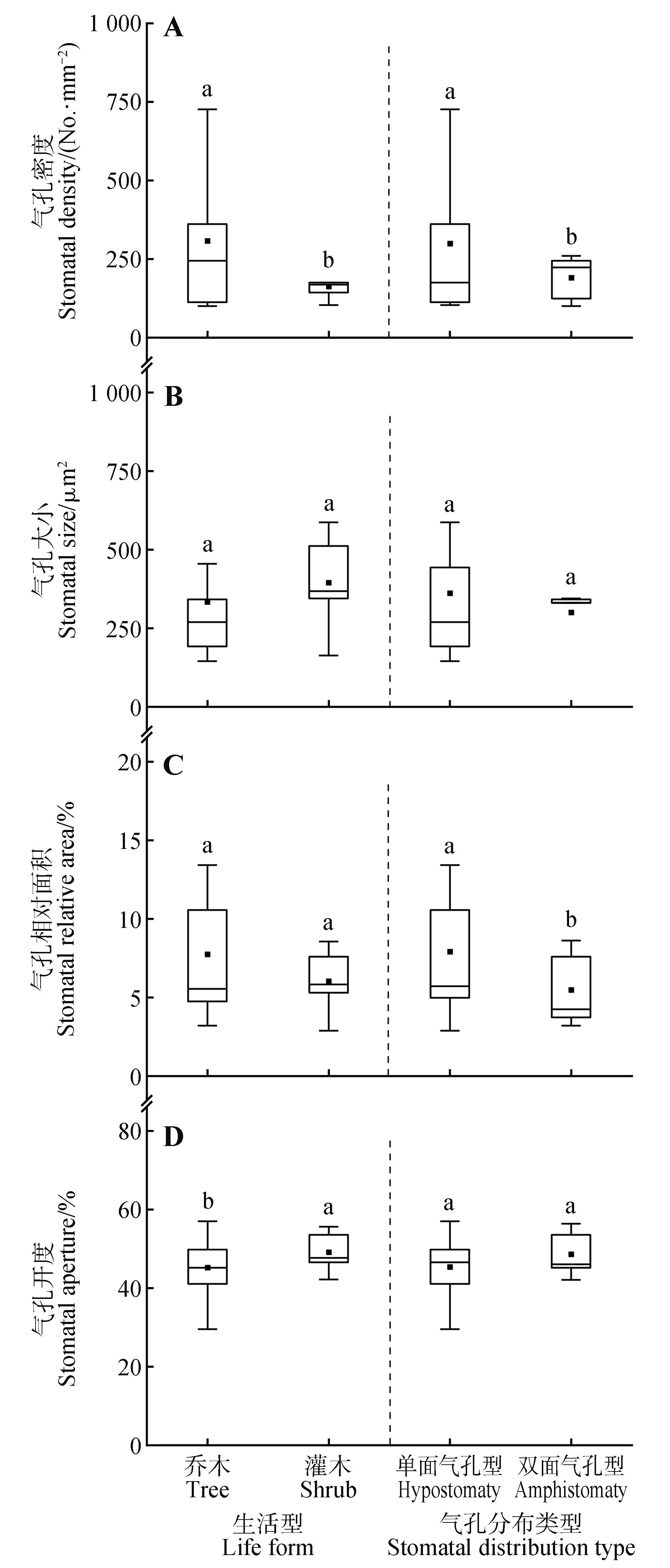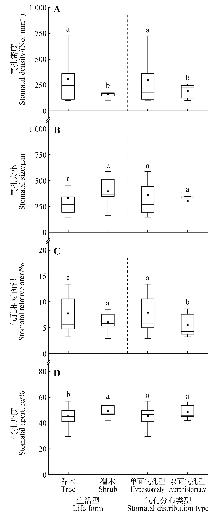 不同生活型和气孔分布类型植物叶片气孔特征差异及其与叶资源经济性状关联