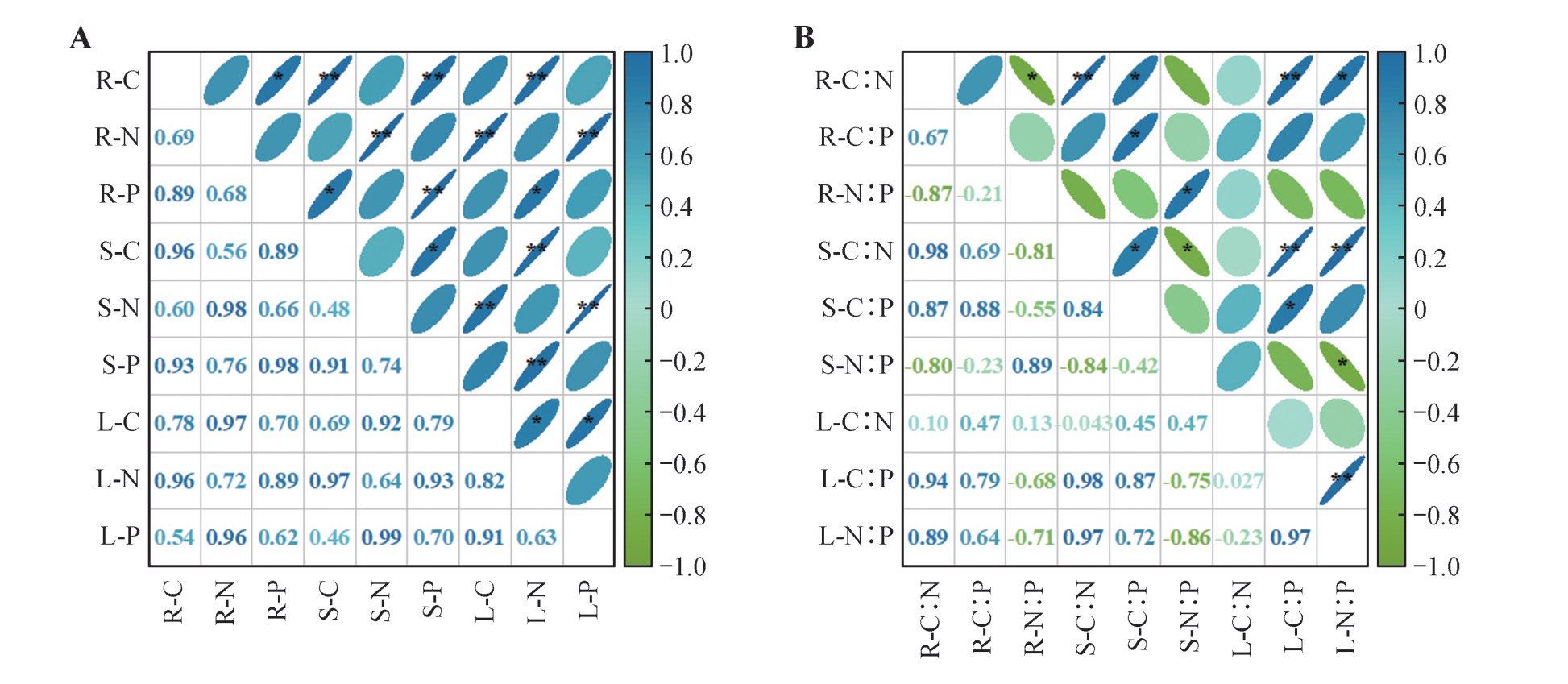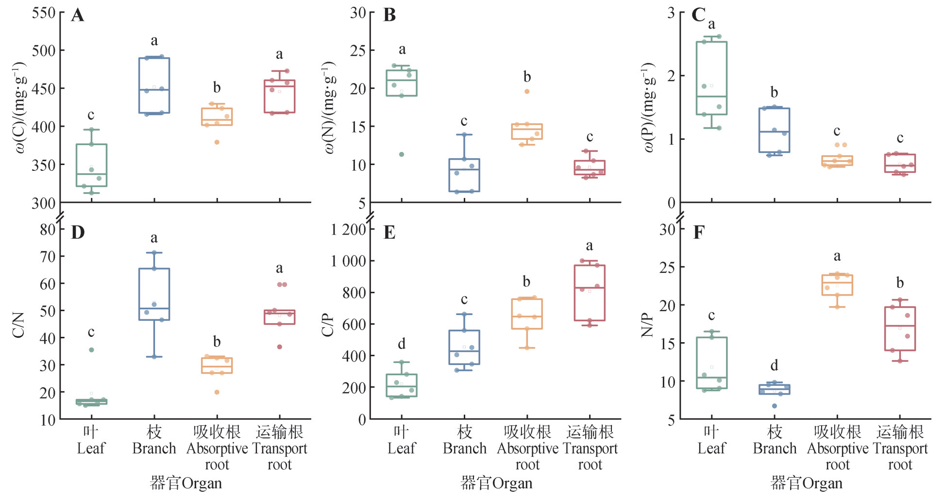 为揭示半干旱地区木本植物的养分限制因子与养分利用策略,研究了内蒙古白音敖包国家级自然保护区6种典型木本植物(乔木和灌木各3种)叶、枝、吸收根和运输根碳(C)、氮(N)、磷(P)化学计量特征的差异和相关性。结果表明:6种木本植物叶平均C/N(质量比)和C/P(质量比)显著低于枝、吸收根和运输根,而吸收根平均N/P(质量比)则显著高于叶、枝和运输根(P<0.05)。乔木叶和枝平均C含量显著高于灌木,而吸收根和运输根C含量显著低于灌木(P<0.05)。乔木叶平均C/N(22.45)、C/P(291.04)分别高于灌木叶C/N(16.16)、C/P(153.70),乔木枝、吸收根和运输根平均C/N(43.84、24.56和43.56)与C/P(369.27、555.20和800.79)则分别低于灌木(C/N为61.97、32.31和52.69;C/P为542.75、725.56和813.76)。乔木仅叶平均N/P(14.12)显著高于灌木(9.53)(P<0.05)。叶C含量与枝C、P含量极显著正相关(P<0.01),吸收根与运输根N、P、C/N和C/P间显著正相关(P<0.05),而地上与地下器官间的相关性相对较弱。综上,乔木叶表现出较高的养分利用效率,而灌木地下器官则具有更高的养分利用效率,叶和枝在C分配上、吸收根和运输根在N、P分配及利用上均表现出协同关系。