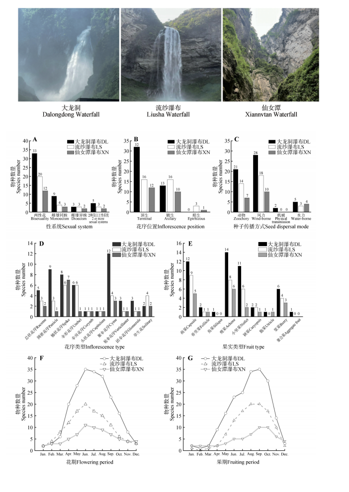 为探究德夯地质公园瀑布生境草本群落物种组成、区系地理成分及多样性特征与变化规律,选取重要值、区系地理成分、物种α和β多样性、营养性状、繁殖性状以及谱系多样性对3个瀑布草本群落进行分析,以期为瀑布生境植物多样性研究提供基础资料。结果表明:德夯地质公园瀑布生境草本植物共35科66属85种,三脉紫菀(Aster ageratoides)、少花马蓝(Strobilanthes oligantha)、冷水花(Pilea notata)、粗齿冷水花(Pilea sinofasciata)为优势种。地理分布区类型符合东亚植物区系特征,其中,大龙洞瀑布生境草本群落热带物种成分相对较多,仙女潭瀑布生境则较少。物种α多样性中大龙洞瀑布生境Shannon-Wiener和Simpson指数较高,但Pielou指数最低;β多样性指数变化一致,在大龙洞瀑布与流纱瀑布生境之间最高,流纱瀑布和仙女潭瀑布生境之间最低。生活习性以多年生草本为主,叶多为中型、单叶、纸质、不裂、锯齿。叶序和叶毛被存在差别;繁殖性状以两性花、顶生和腋生、干果、种子风力传播为主,花期集中在5—8月,果期集中在8—10月,花序类型存在差异。草本群落呈现聚集状态,环境过滤作用是影响群落构建的主要因素。德夯瀑布生境草本群落植物多样性特征与其他群落相比具有独特性。