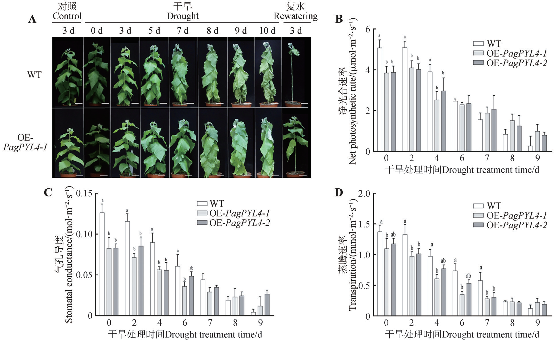 在气候变化和耕地资源日益紧张背景下,提升林木抗旱性成为重要育种目标。然而,抗旱性改良不应以牺牲生物量积累为代价。该研究在84K杨(Populus alba×P. glandulosa ‘84K’)中构建了组成型过表达PagPYL4基因株系,系统分析其在气孔调控、光合效率、生长性状及干旱响应方面的综合表现。结果表明,在外源ABA影响下,过表达PagPYL4基因使植株气孔开度变化显著。短期干旱处理下,相较于野生型,过表达PagPYL4基因能够减少水分散失,提升耐旱性;但抑制气孔导度和光合速率,造成株高与地径增长速率显著下降。该研究揭示了在林木抗逆改良中,仅依赖组成型表达难以实现理想育种目标,应探索更精准的表达调控策略以实现抗性与生长的协同优化。