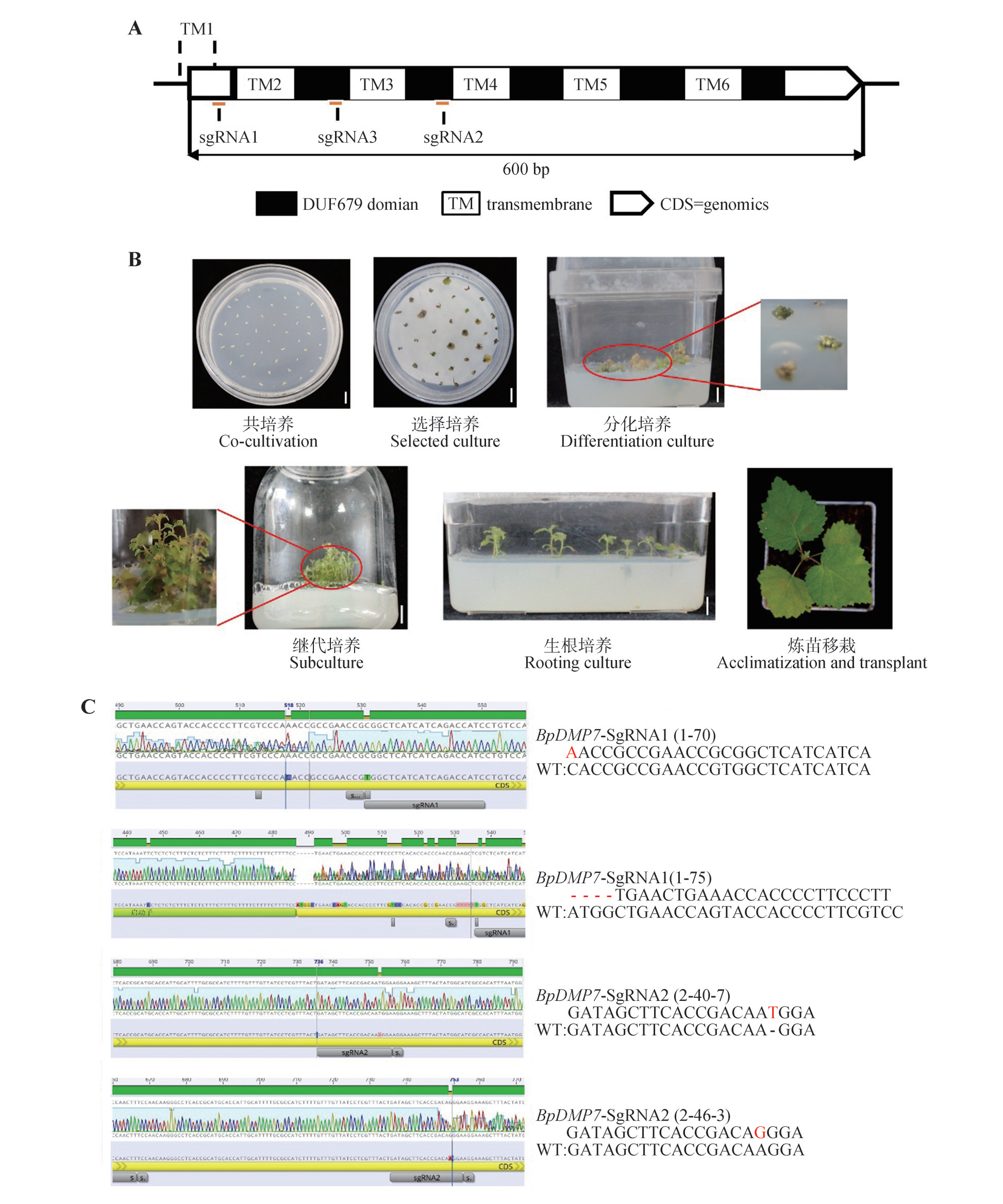 白桦(Betula platyphylla)作为多年生木本植物因生长周期较长、基因型复杂等问题,育种过程中难以获得纯合植株和家系,进而导致育种工作进展较慢。双单倍体(doubled haploid,DH)育种技术是近年来兴起的一种育种方法,只需要两代即可得到纯合的植物家系。因此,DH育种技术可以大大缩短林木育种周期并获得纯合家系,而DMP基因的发现与应用为双单倍育种开辟了一个新的研究方向。该研究旨在通过生物信息学分析揭示白桦BpDMPs基因家族的理化性质、蛋白结构、系统进化、基因结构、染色体分布及其在白桦生长发育过程中潜在的功能;通过表达模式分析鉴定该基因家族中具有单倍体诱导功能的白桦DMP基因,并通过拟南芥(Arabidopsis thaliana)回补试验验证基因功能。生物信息学分析结果显示:在白桦中,DMP基因包含14个基因家族成员,分布在6条染色体上;系统发育分析表明,BpDMPs基因家族中14个基因分属5个分支;对启动子顺式作用元件的预测分析表明,BpDMPs基因家族的启动子中包含生长发育、激素代谢、胁迫响应等相关的反应元件。qRT-PCR结果显示,BpDMPs在白桦各组织中表达水平差异较大,其中,BpDMP2和BpDMP7在雄蕊中表达量较高,拟南芥回补试验证明,BpDMP7基因可以回补拟南芥dmp8dmp9突变体籽粒败育的表型。为进一步验证BpDMP7诱导白桦产生单倍体,用CRISPER/Cas9基因编辑技术将该基因进行靶向敲除并获得突变体植株。该研究为进一步研究白桦BpDMPs基因家族的功能和调控机制提供了基础信息,并为理解这些基因在植物生长发育及环境适应过程中扮演的角色提供了新的视角。