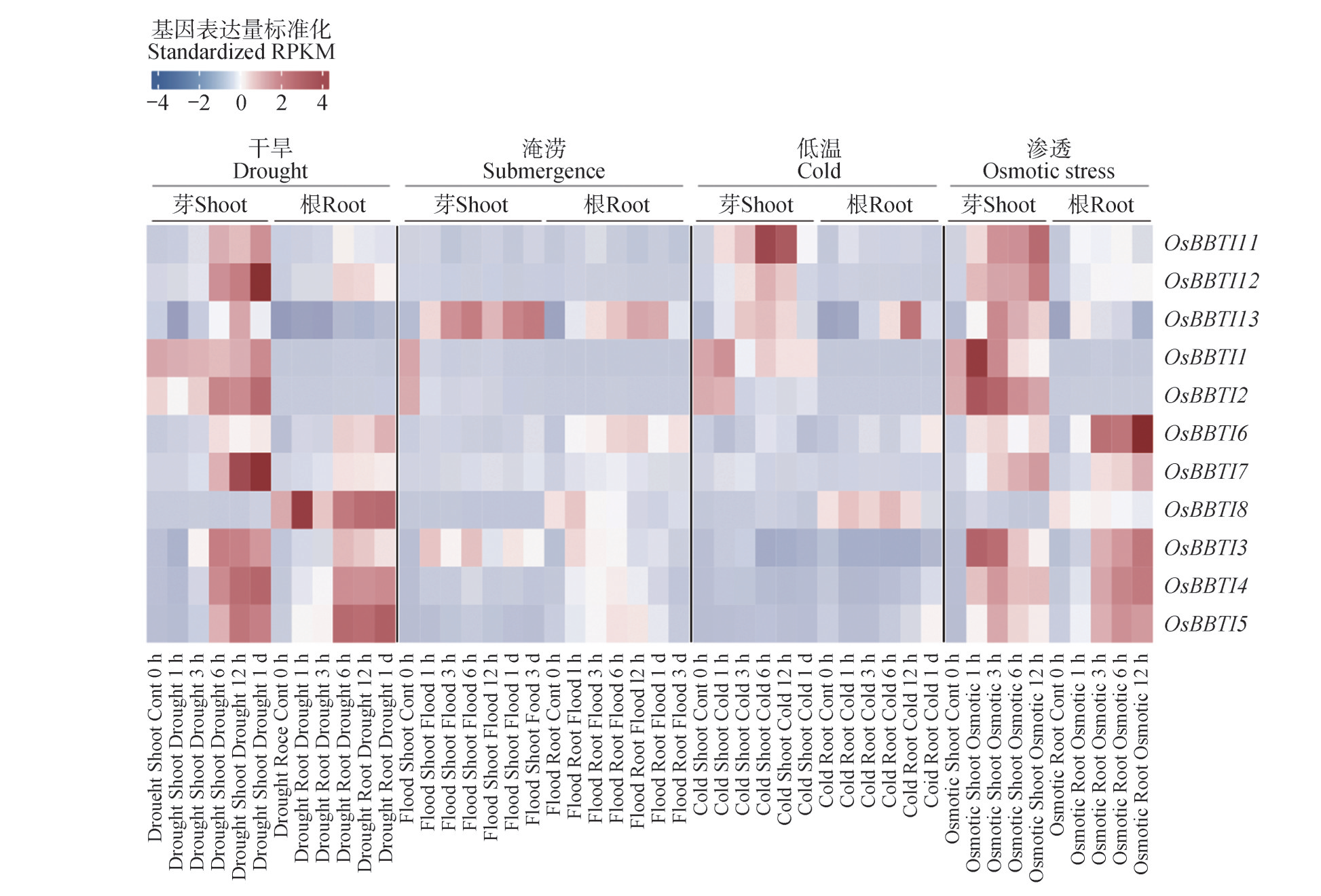 Bowman-Birk型胰蛋白酶抑制剂(Bowman-Birk type trypsin inhibitor,BBTI)是植物中广泛分布的一类胰蛋白酶抑制剂,在植物抵御胁迫过程中发挥重要作用。该研究利用生物信息学方法在基因组水平上鉴定出11个水稻(Oryza sativa)BBTIs基因家族成员,其中,10个OsBBTIs基因成簇聚集于1号染色体前端,而另外1个OsBBTI13基因定位于3号染色体。OsBBTIs蛋白具有N端信号肽和1~3个典型保守的Bowman-Birk型结构域。OsBBTIs基因的启动子区具有响应茉莉酸和脱落酸及非生物胁迫应激反应相关响应元件。转录组数据显示,所有OsBBTIs基因表达能够被茉莉酸诱导,多数OsBBTIs基因表达可以响应非生物胁迫。利用qRT-PCR检测NaHCO3和NaCl胁迫下水稻OsBBTIs基因表达水平,结果显示,盐碱胁迫显著诱导OsBBTIs基因表达。该研究可为进一步研究OsBBTIs蛋白在非生物胁迫中的功能奠定基础。