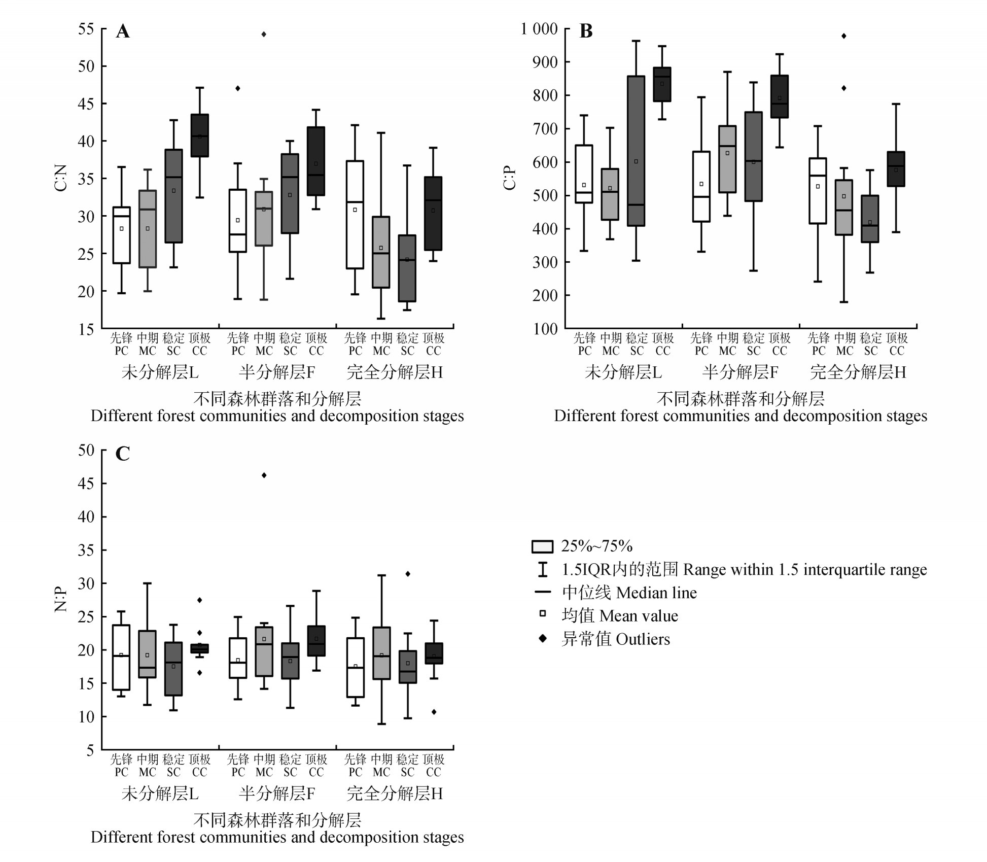 凋落物为森林生态系统活跃碳(C)库,其C储量变化直接影响森林生态系统C汇能力。为明确阔叶红松(Pinus koraiensis)林凋落物C储量及其化学计量特征,并说明凋落物生态化学计量特征对其C储量的影响,揭示凋落物在生态系统C汇能力及养分循环中的作用,以阔叶红松林中生演替过程中不同演替阶段的4种森林类型(天然枫桦(Betula costata)次生林、次生阔叶林、次生针阔混交林、原始阔叶红松林)为研究对象,分析2021年7月和10月及2022年5月和8月各层(未分解层、半分解层、完全分解层)凋落物的现存量、C储量及C、氮(N)、磷(P)化学计量特征,利用冗余分析评估凋落物化学计量特征及上层植被群落特征(乔木生物量、乔木多样性、针阔比例)对凋落物C储量的相对贡献,利用线性回归分析量化凋落物化学计量特征对C储量的影响。结果表明:森林群落沿正向演替,凋落物总C储量表现出“先减小后增大”的变化趋势,且在原始阔叶红松林(顶极群落)达到最大值。顶极群落中凋落物表现出高C低P的特点,并且C∶N(质量比)与C∶P(质量比)最高。冗余分析表明,在衡量上层植被变化指标中,针阔比例是解释凋落物C储量变化的主要因子,且与凋落物C储量呈正相关。线性回归分析表明,凋落物C储量与C∶N、C∶P呈显著正相关,与N∶P(质量比)呈显著负相关,C∶N、N∶P对C储量的解释率最高,R2均为0.17。该研究表明,顶极群落凋落物C储量高于其余3种群落,这与顶极群落凋落物高C低P特征及乔木层具有较高的针阔树种比例密切相关。