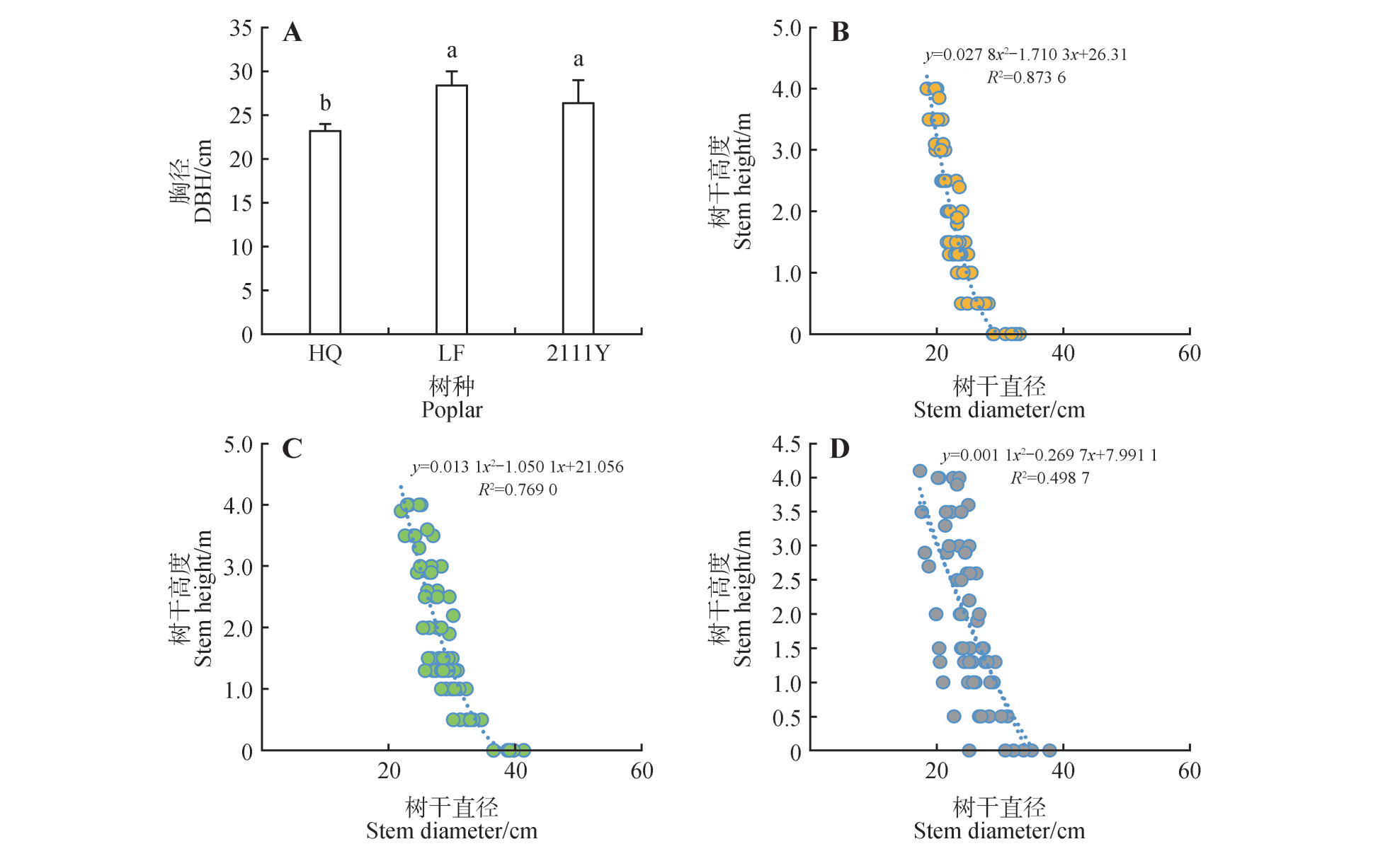 针对松嫩平原杨树人工林立地品种配置吻合度低问题,以黑龙江西部适生杨树良种黑青杨(Populus euramericana ‘N3016’×P. ussuriensis)、龙丰1号杨(P. deltoides×P. simonii ‘LongFeng-1’)、齐林1号杨(P. euramericana(Dode) cv. ‘DN113’)为对象,对比分析3个树种生长、枝叶元素化学计量关系、叶片生理特征。结果表明:3个树种年均径向生长速率为2.32~2.84 cm·a-1,其中,龙丰1号杨径向生长速率最快,齐林1号杨次之,均显著高于黑青杨(P<0.05);3个树种树干直径与树干高度之间呈二项式函数关系。龙丰1号杨和齐林1号杨枝含水率显著高于黑青杨(P<0.05);龙丰1号杨叶片比叶面积高于其他2个树种。3个树种标准枝附属高级枝及叶元素含量和元素化学计量比均存在显著差异,其中,龙丰1号杨叶片和枝氮(N)和钾(K)含量最高,齐林1号杨次之,黑青杨最低,齐林1号杨叶片磷(P)含量高于龙丰1号杨和黑青杨;3个树种标准枝附属高级枝叶片C∶N(质量比)为19.41~21.65,N∶P(质量比)为6.01~9.40。3个树种叶片碳、氮代谢水平存在显著差异,其中,黑青杨叶片可溶性糖、淀粉、非结构性碳水化合物含量高于龙丰1号杨、齐林1号杨;黑青杨叶片硝态氮、铵态氮和可溶性蛋白含量高于齐林1号杨,但游离氨基酸含量低于其他2个树种(P<0.05)。不同品种之间叶片激素水平存在差异,其中,黑青杨叶片水杨酸含量低于龙丰1号杨和齐林1号杨(P<0.05);齐林1号杨叶片脱落酸含量低于龙丰1号杨(P<0.05);龙丰1号杨叶片生长素含量低于齐林1号杨。3个树种叶片赤霉素含量无显著差异。