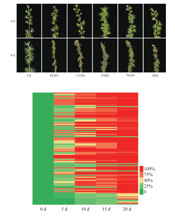 该研究以2年生18个落叶松(Larix gmelinii)实生苗家系为试验对象,采用剥皮套管法接种强致病性松材线虫株系FSBX。通过计算落叶松抗显症得分、抗虫得分和抗病得分,综合筛选抗松材线虫落叶松家系。通过测定接种后第0、5、10、15天针叶叶绿素、可溶性糖、可溶性蛋白含量及超氧化物歧化酶(SOD)、抗氧化物酶(POD)活性等指标,探究落叶松在抵抗松材线虫过程中生理指标变化趋势。结果表明:抗病得分最高的落叶松是家系1311,其次是家系1305和1310。不同抗性的落叶松针叶叶绿素含量变化趋势均为先降低后升高再降低。POD活性则表现为先降低后升高再小幅降低的趋势,接种第15天时,高抗家系的POD活性显著高于其他家系;SOD活性呈现先升高后降低的趋势,接种第10天时达到峰值,高抗家系显著高于其他家系。可溶性蛋白含量表现出先降低后升高的趋势,在接种第15天时,高抗家系的可溶性蛋白含量高于其他2组,差异不显著。可溶性糖含量呈现先降低后升高再降低的趋势,接种第10天时各家系可溶性糖含量达到峰值,且感病家系可溶性糖含量高于中抗家系,而中抗家系可溶性糖含量高于高抗家系,三者差异不显著。综上,高抗家系落叶松在针叶叶绿素含量、POD和SOD活性方面表现出显著优势,而可溶性糖及可溶性蛋白含量普遍低于其他家系,但在病害后期,高抗家系的生理指标高于中抗及感病家系,说明高抗家系在逆境胁迫后期仍能维持较高的抗逆性。