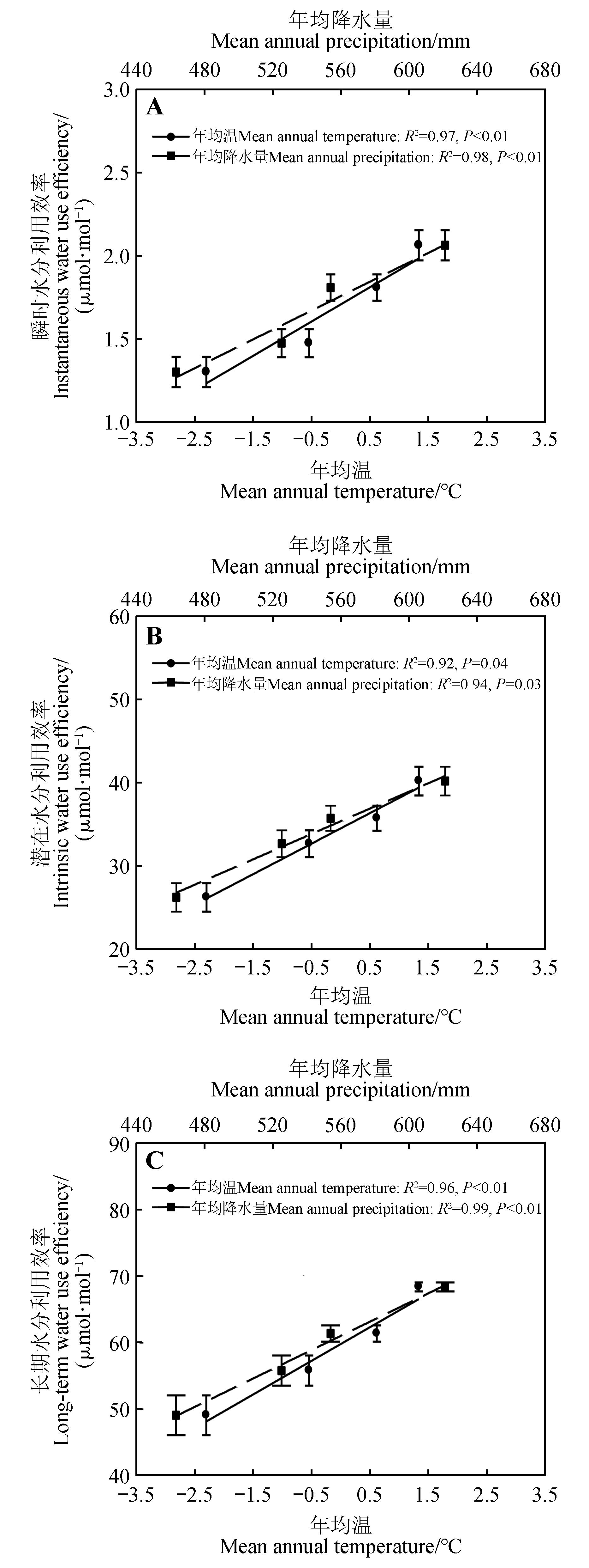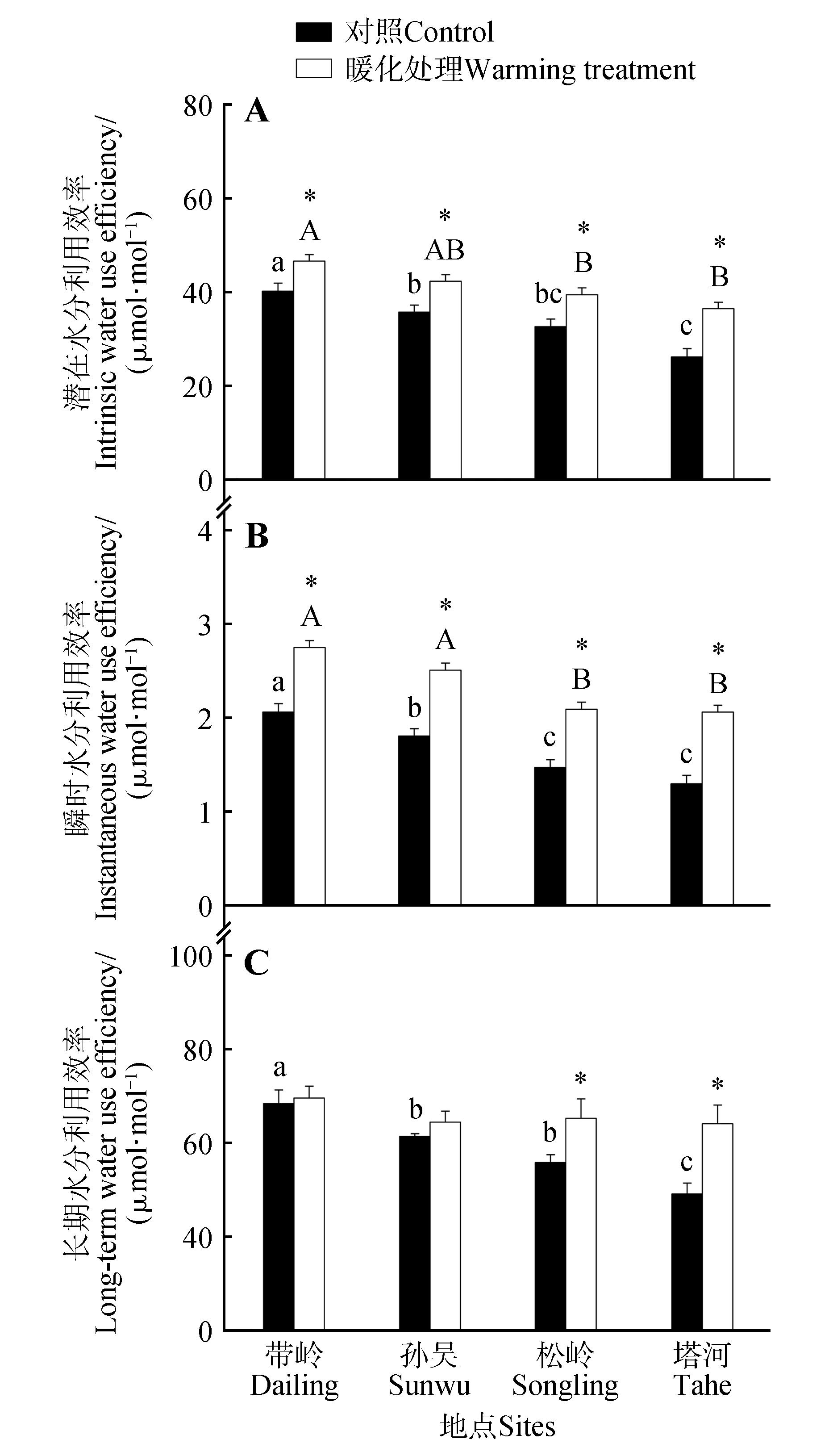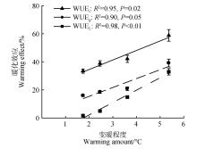 研究气候变暖对树木水分利用效率的影响,有利于揭示树木碳水耦合关系对全球气候变暖的响应。2004年,将4个不同气温地点(年均温从低到高依次为塔河、松岭、孙吴、带岭)生长的兴安落叶松(Larix gmelinii)幼树移栽至其自然分布区南缘的同质园(帽儿山),通过被动增温模拟气候变暖。2022年8月,在同质园和4个移栽地同步采用气体交换法测定兴安落叶松瞬时水分利用效率(WUEi)和潜在水分利用效率(WUEg),并用碳同位素丰度表示长期水分利用效率(WUEL),探讨不同模拟变暖程度对兴安落叶松水分利用效率的影响。结果表明:WUEi和WUEg在不同模拟变暖程度下均显著增大,塔河、松岭、孙吴、带岭的WUEi分别增大33.37%、38.84%、42.06%和58.76%,WUEg分别增大15.94%、18.47%、20.84%和39.10%,WUEL仅在模拟变暖程度较大的松岭和塔河显著增大16.92%和30.56%。WUEi、WUEg和WUEL增大的幅度均与模拟变暖程度呈线性正相关。模拟气候变暖处理前后,WUEi和WUEg均存在显著的地点间差异且具有相似规律,而WUEL仅在模拟气候变暖处理前具有显著的地点间差异。WUEi对模拟气候变暖处理的响应最为敏感,而WUEL仅在模拟变暖程度较大时表现出差异性响应。综上,在研究气候变暖对树木水分利用效率影响时,既要考虑变暖的程度,也要考虑计算方法。