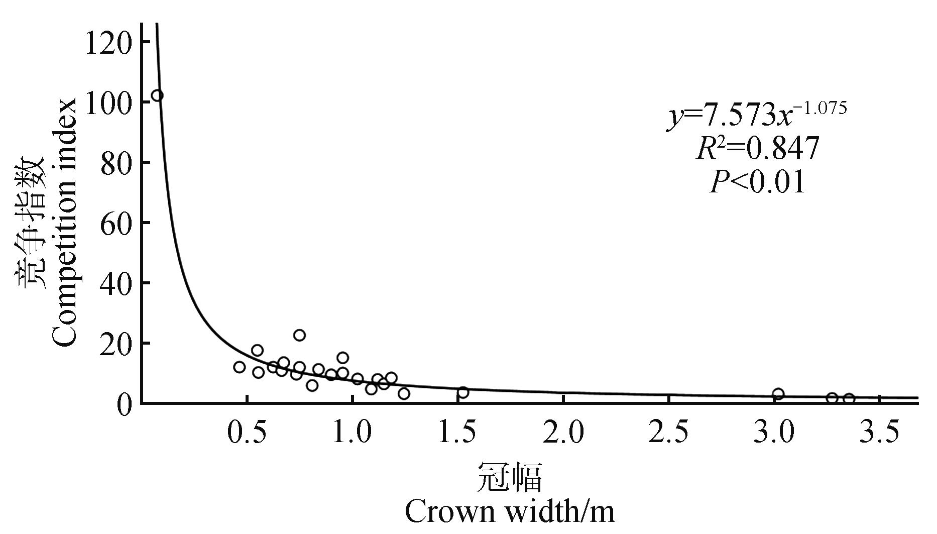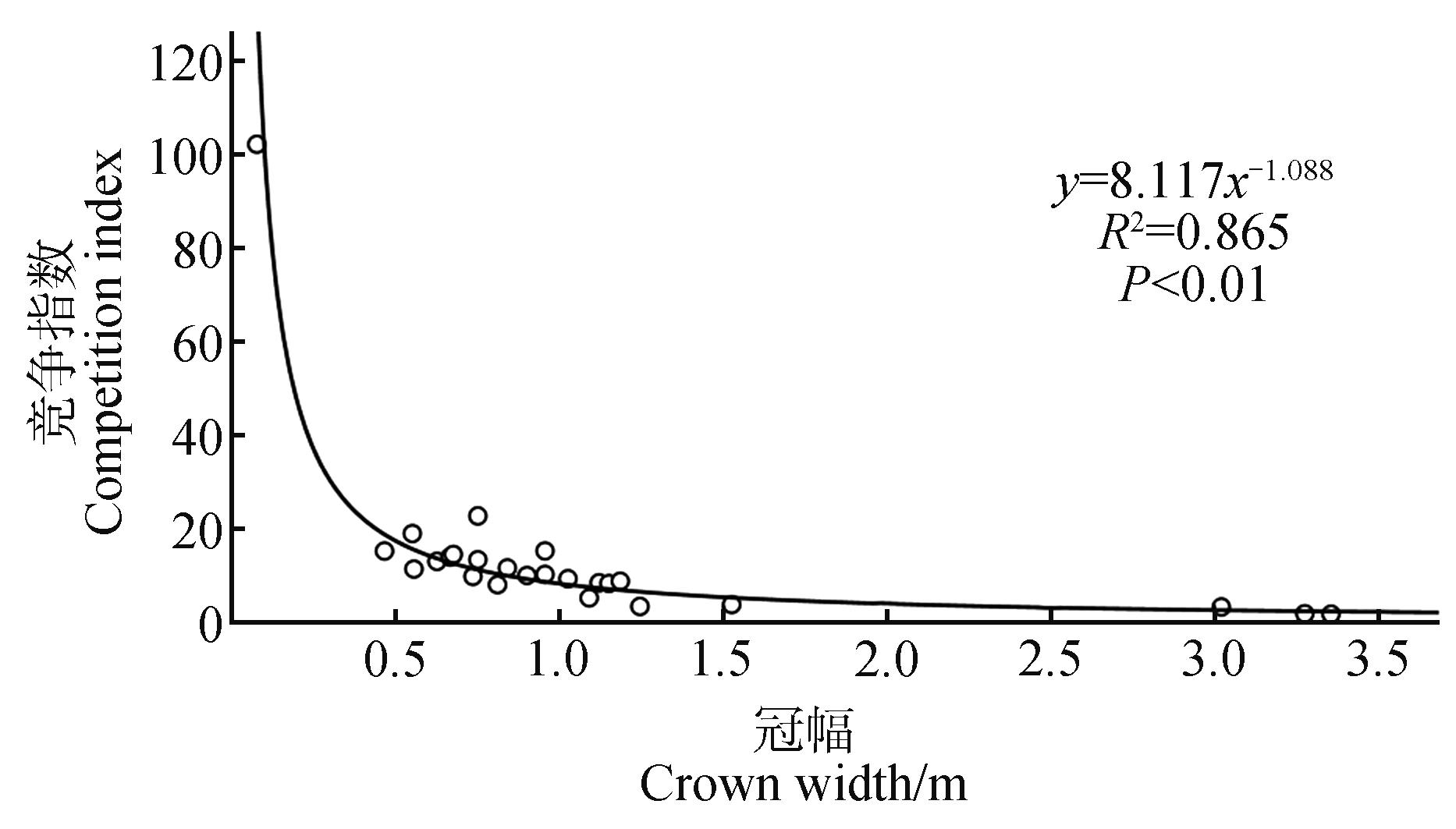 In order to clarify the competitive influence of rare and endangered plant Ammopiptanthus mongolicus, this study selected the ecotone between A.mongolicus and Zygophyllum xanthoxylum, and used Hegyi single tree competition model to analyze the intraspecific and interspecific competition relationship by investigating 25 target trees of A.mongolicus. The results showed that intraspecific and interspecific competition intensity of A.mongolicus accounted for 5.09% and 94.91% of the total competition intensity(341.32), respectively, indicating that the competition of A. mongolicus was mainly derived from interspecific competition. There were many competing tree species of A.mongolicus in the ecotone, and the competition intensity from high to low was Artemisia xerophyticaCaragana brachypoda,Z.xanthoxylum,Oxytropis aciphyllaA.mongolicusReaumuria trigynaKrascheninnikovia ceratoidesReaumuria soongaricaPotaninia mongolicaAsparagus gobicus. The relationship of the interspecific competition index and the total competition index with the crown width of A.mongolicus was approximately subject to the power function relationship, and the competition intensity decreased with the increase of crown width of target trees. When the crown width of target trees was less than 1.0 m, the competitive pressure was greater, and the obtained model could well reflect the competitive intensity of A.mongolicus.