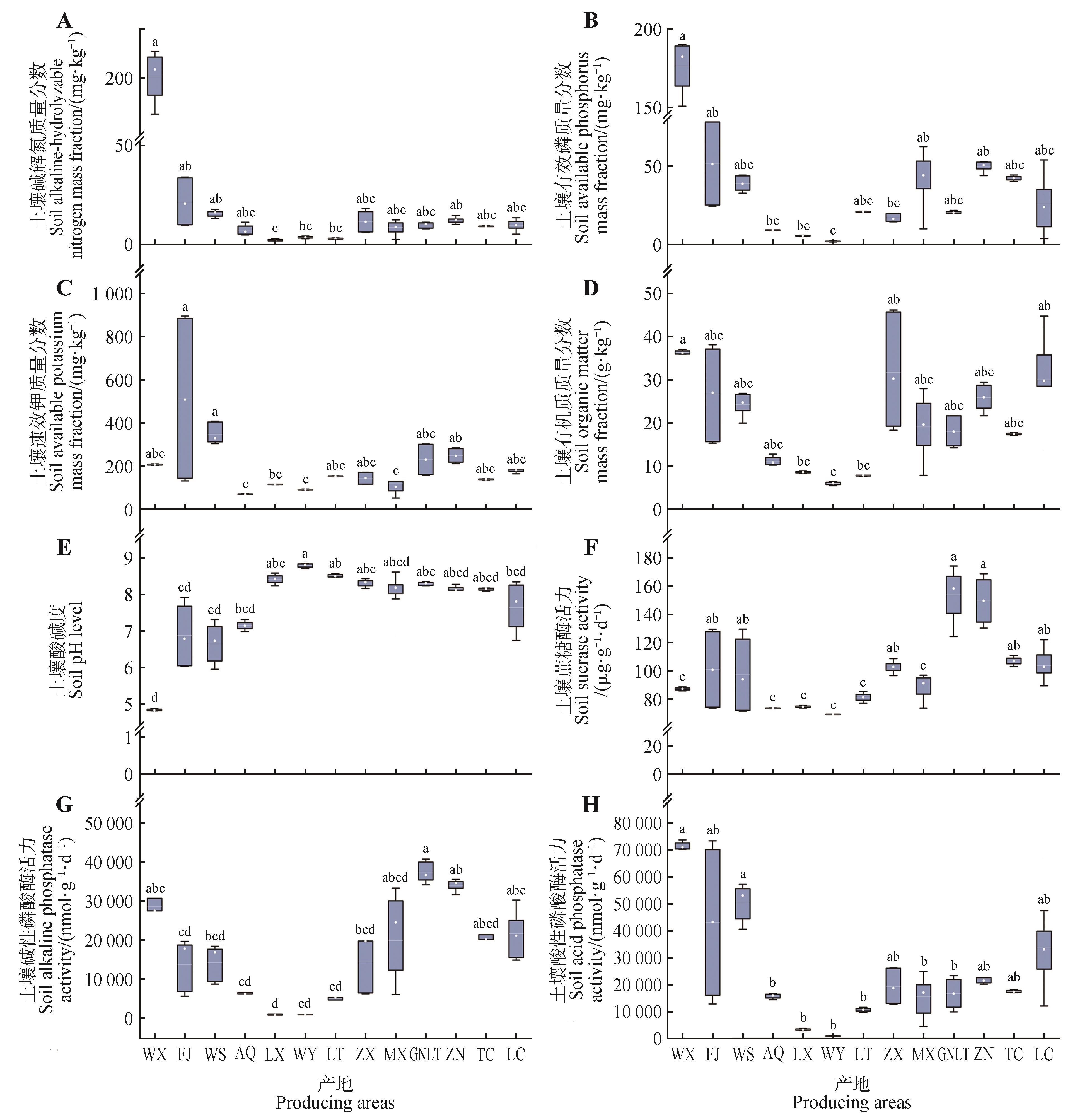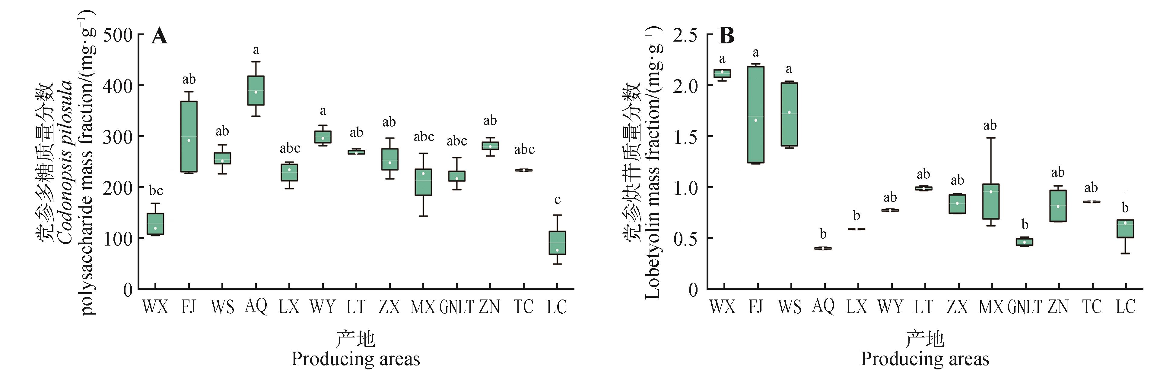 To clarify the key factors affecting the content of active ingredients in Codonopsis pilosula, and to provide scientific basis for the selection of producing areas’ environmental factors for standardized cultivation, the effects of 32 environmental factors such as meteorology and soil conditions in different producing areas were explored. In this study, samples of cultivated C. pilosula and its root zone soil were collected from a total of 27 sampling sites in the main producing areas(Chongqing, Inner Mongolia, Gansu, and Shanxi). The soil physicochemical indicators from different producing areas and the contents of lobetyolin and polysaccharides in C. pilosula weremeasured, and the correlations between various environmental factors and the active ingredients in C. pilosula were analyzed. The results indicated that there were regional differences in the content of active ingredients in C. pilosula. The highest polysaccharide content was 386 mg⋅g-1 in samples collected from Ar Horqin Banner in Chifeng city. The highest lobetyolin content was 2.128 mg⋅g-1 in samples collected from Wuxi in Chongqing city. Among the factors contributing to the variance in the content of active ingredients in C. pilosula from different producing areas, monthly extreme temperature had the highest contribution, followed by soil enzyme activity and organic matter factors, with soil nutrients contributing the least. The effects of different environmental factors on accumulation of polysaccharides and lobetyolin in C. pilosula varied in different producing areas. Polysaccharides contents in C. pilosula were mainly influenced by soil organic matter, precipitation in October, and soil alkaline phosphatase activity, while lobetyolin was primarily affected by soil available nitrogen, soil acid phosphatase activity, the minimum temperature in May and July-August, and soil pH. In summary, monthly extreme temperature was the main factor driving the variation in content of active ingredients in C. pilosula, and attention should be paid to the impacts of precipitation, soil nutrients, and phosphatase activity.