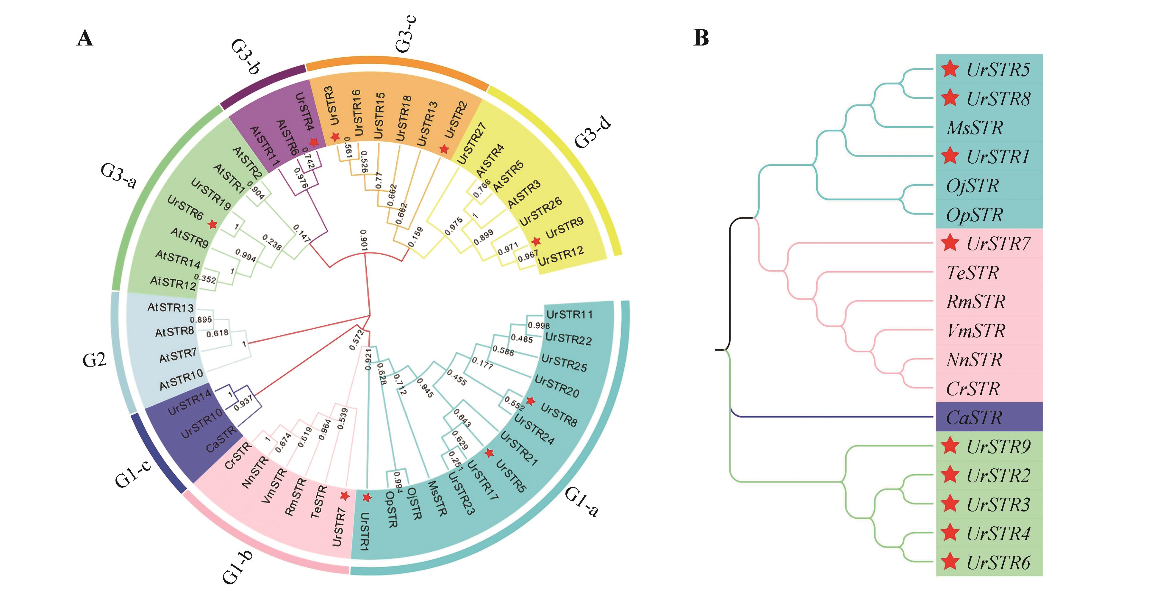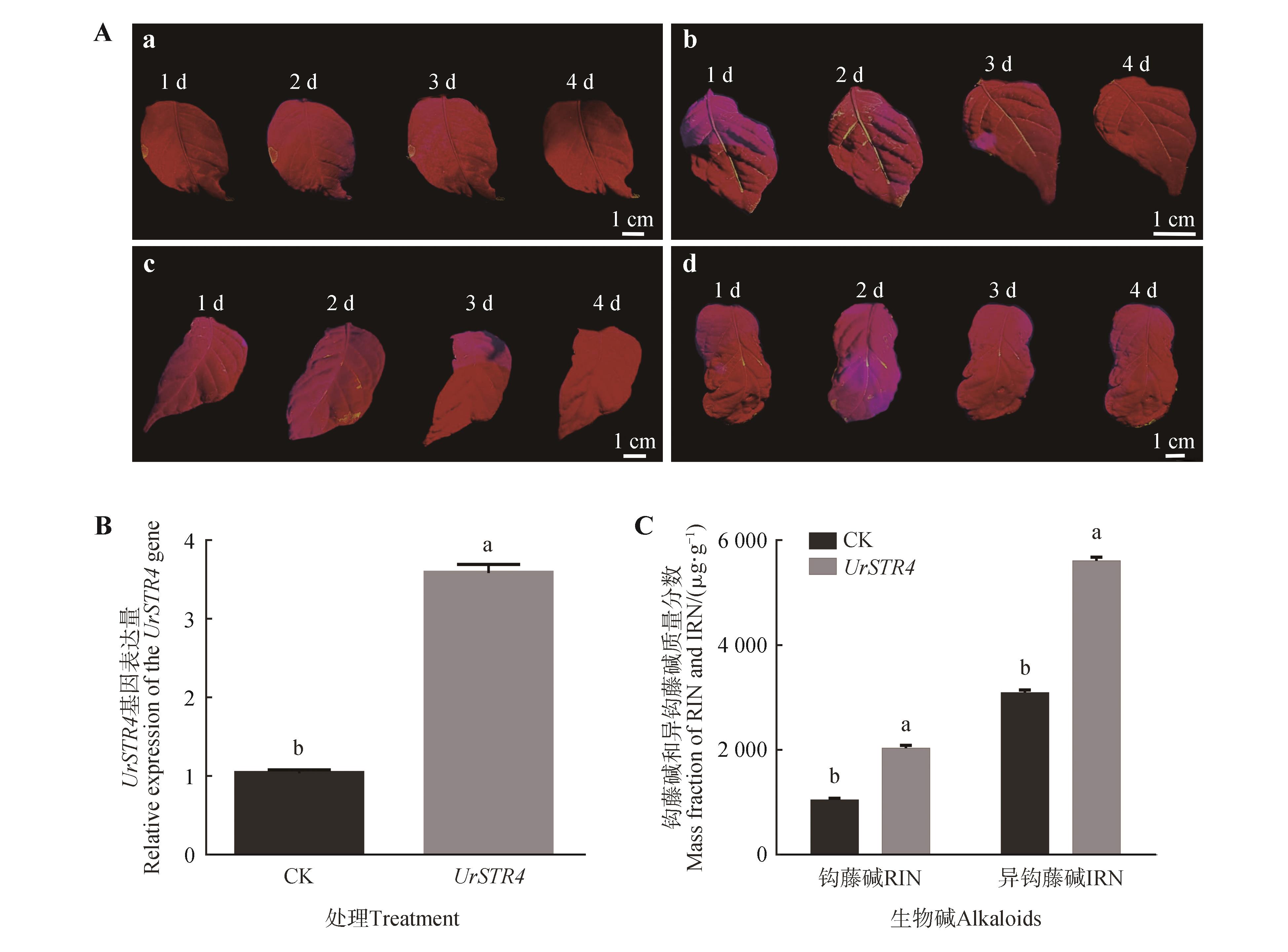 Uncaria rhynchophylla is a traditional Chinese medicinal herb, whose active components rhynchophylline(RIN) and isorhynchophylline(IRN) exhibit remarkable pharmacological activities. Strictosidine synthase(STR) is the key enzyme for RIN and IRN biosynthesis, yet the functional divergence of STR gene family in U. rhynchophylla remains unclear. Utilizing transcriptome data of U. rhynchophylla seedlings under shading and ethylene treatments, 27 STR genes(UrSTR1-UrSTR27) were systematically identified in U. rhynchophylla. Evolutionary analysis revealed significant expansion of UrSTR gene family, suggesting functional diversification in response to environmental cues. Exogenous salicylic acid(SA) treatment(0.6 mmolL-1) markedly increased RIN and IRN contents, while upregulating UrSTR4 expression level by 30.6-fold. Multiple sequence alignment showed UrSTR4 lacked the conserved Glu-309 residue but shared hydroxyl-containing residues with Camptotheca STR3. An efficient transient transformation system(8 kPa pressure, 1-min Agrobacterium infection) was established by using plant living transformation instrument. The transient overexpression of UrSTR4 enhanced RIN and IRN contents by 1.96- and 1.82-fold, respectively. This study identified new targets for metabolic regulation of bioactive compounds in U. rhynchophylla and the established transient transformation system provided technical support for functional research on UrSTR genes.