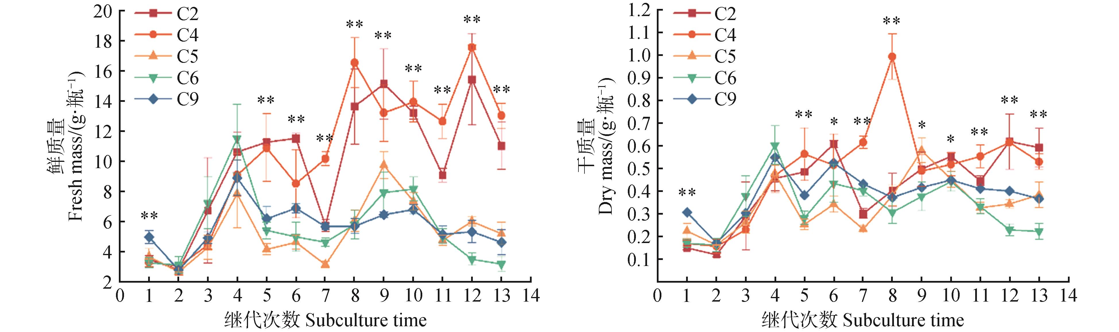 Fresh and dry mass changes of the calli of Cyclocarya paliurus during subculture proliferation in the five treatmentsC2,C4,C5,C6,C9 represented treatment 2,4,5,6,9,respectively;* indicated significant difference at the level of 0.05 between different treatments with the same subculture time (P<0.05),** indicated significant difference at the level of 0.01 between different treatments with the same subculture time (P<0.01).