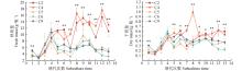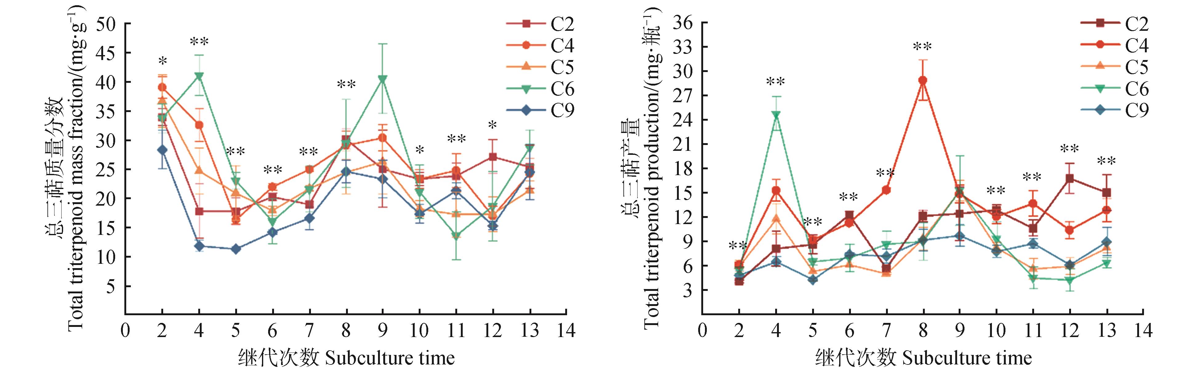 Total triterpenoid mass fraction and yield changes of the calli of Cyclocarya paliurus during subculture proliferation in the five treatmentsC2,C4,C5,C6,C9 represented treatment 2,4,5,6,9,respectively;* indicated significant difference at the level of 0.05 between different treatments with the same subculture time (P<0.05),** indicated significant difference at the level of 0.01 between different treatments with the same subculture time (P<0.01).