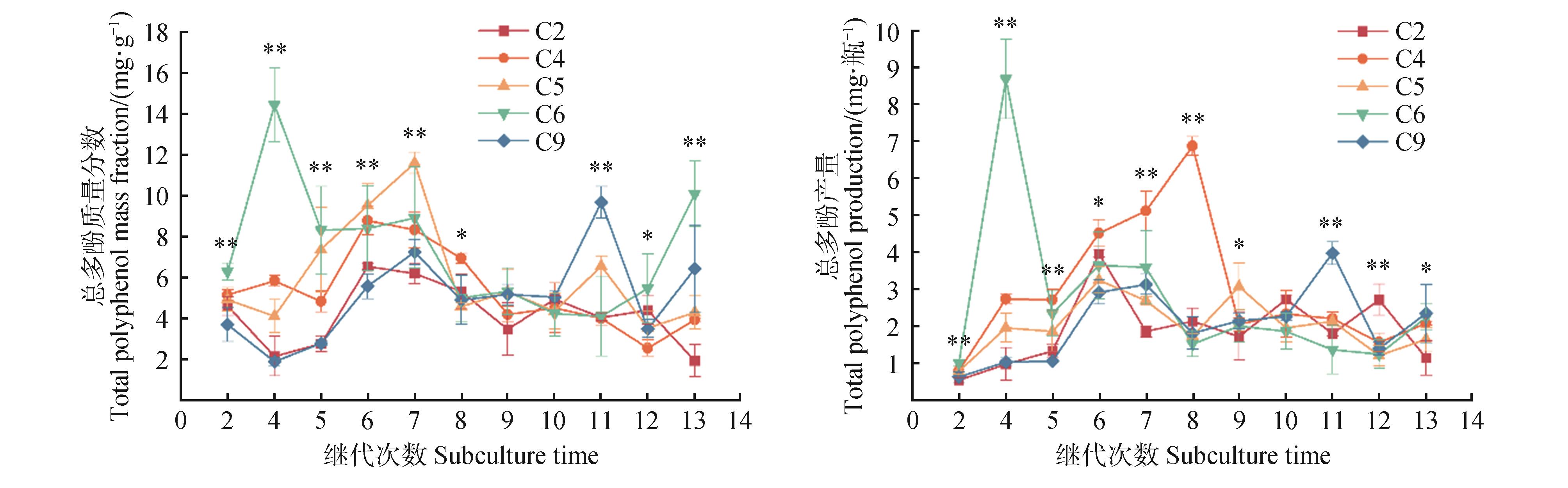Total polyphenol mass fraction and yield changes of the calli of Cyclocarya paliurus during subculture proliferation in the five treatmentsC2,C4,C5,C6,C9 represented treatment 2,4,5,6,9,respectively;* indicated significant difference at the level of 0.05 between different treatments with the same subculture time (P<0.05),** indicated significant difference at the level of 0.01 between different treatments with the same subculture time (P<0.01).
