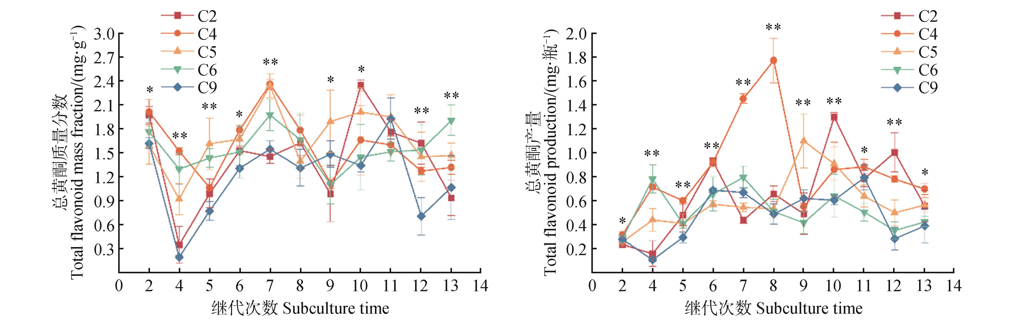 Total flavonoid mass fraction and yield changes of the calli of Cyclocarya paliurus during subculture proliferation in the five treatmentsC2,C4,C5,C6,C9 represented treatment 2,4,5,6,9,respectively;* indicated significant difference at the level of 0.05 between different treatments with the same subculture time (P<0.05),** indicated significant difference at the level of 0.01 between different treatments with the same subculture time (P<0.01).