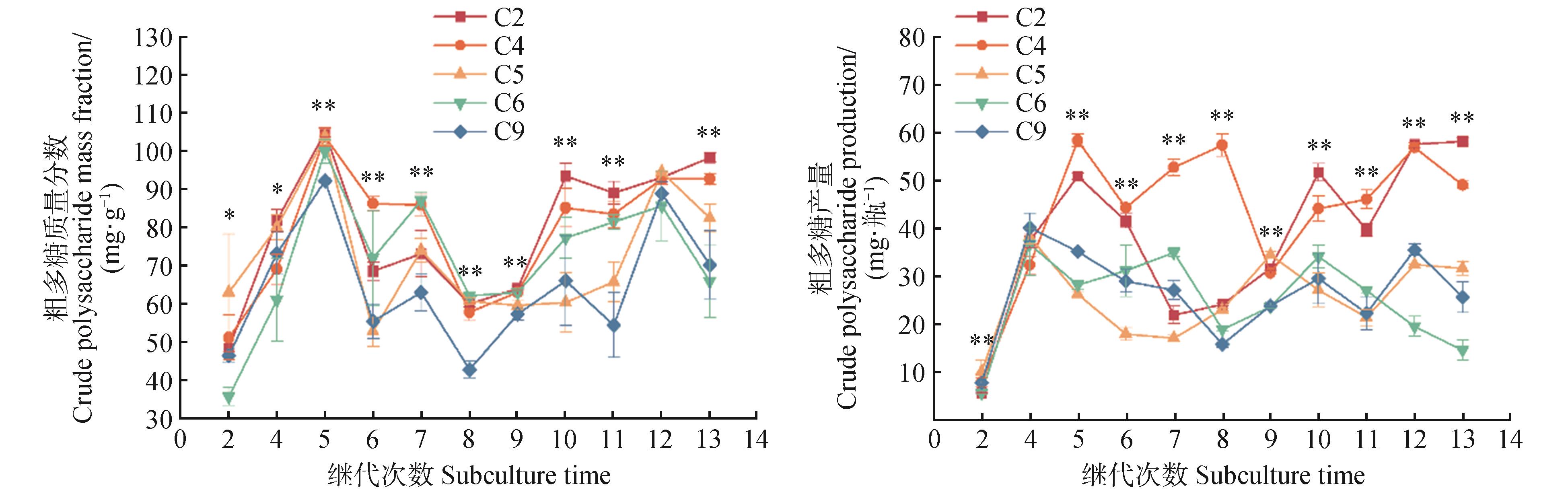 Crude polysaccharide mass fraction and yield changes of the calli of Cyclocarya paliurus during subculture proliferation in the five treatmentsC2,C4,C5,C6,C9 represented treatment 2,4,5,6,9,respectively;* indicated significant difference at the level of 0.05 between different treatments with the same subculture time (P<0.05),** indicated significant difference at the level of 0.01 between different treatments with the same subculture time (P<0.01).