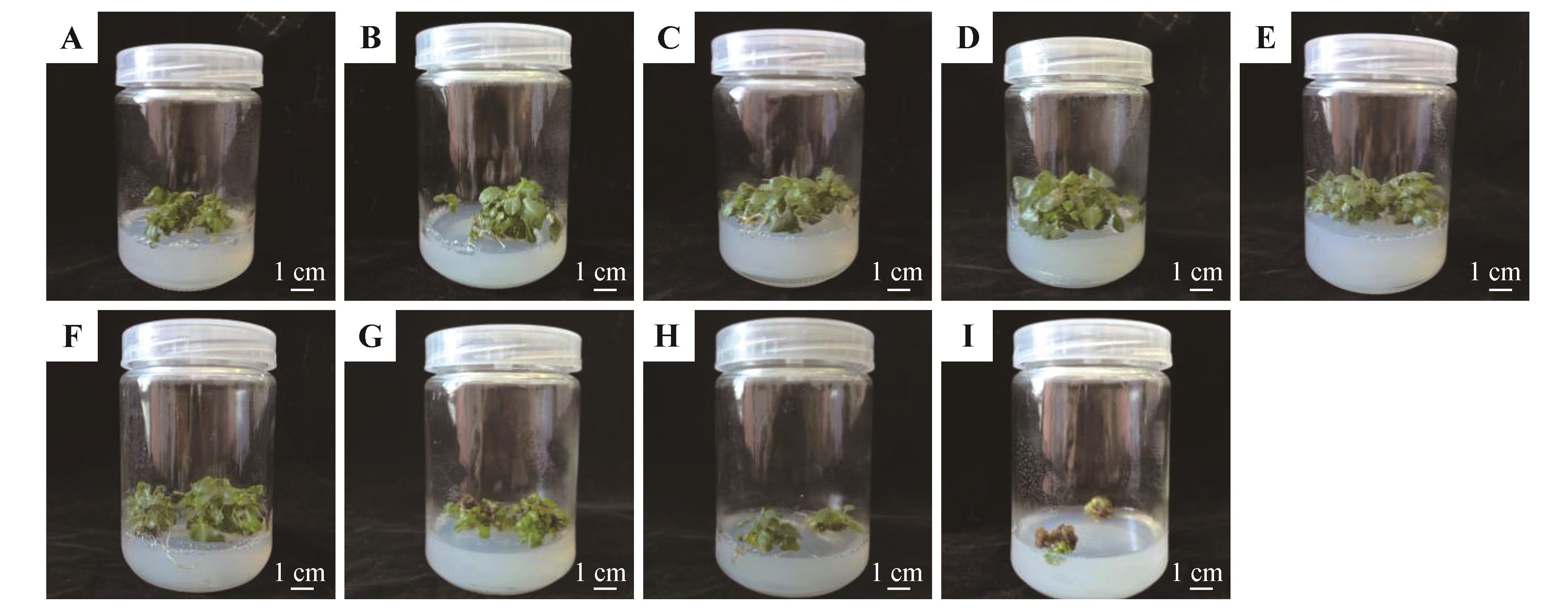 Proliferation of clustery shoots of S. petrophila under the hormone combinations with different mass concentrationsA. The treatment of 0.5 mg·L-1 6-BA and 0.1 mg·L-1 NAA; B. The treatment of 0.5 mg·L-1 6-BA and 0.2 mg·L-1 NAA; C. The treatment of 0.5 mg·L-1 6-BA and 0.3 mg·L-1 NAA; D. The treatment of 1.0 mg·L-1 6-BA and 0.1 mg·L-1 NAA; E. The treatment of 1.0 mg·L-1 6-BA and 0.2 mg·L-1 NAA; F. The treatment of 1.0 mg·L-1 6-BA and 0.3 mg·L-1 NAA; G. The treatment of 1.5 mg·L-1 6-BA and 0.1 mg·L-1 NAA; H. The treatment of 1.5 mg·L-1 6-BA and 0.2 mg·L-1 NAA; I. The treatment of 1.5 mg·L-1 6-BA and 0.3 mg·L-1 NAA.
