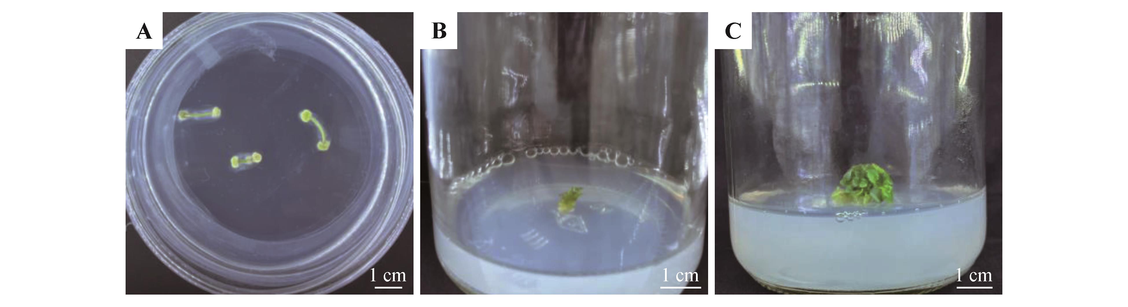 Callus induction and differentiation of stem segments of sterile S. petrophila seedlingsA.The stem segments were inoculated onto the callus induction medium for 14 days;B.The callus was inoculated onto differentiation medium for seven days;C.The callus was inoculated onto differentiation medium for 14 days.