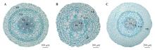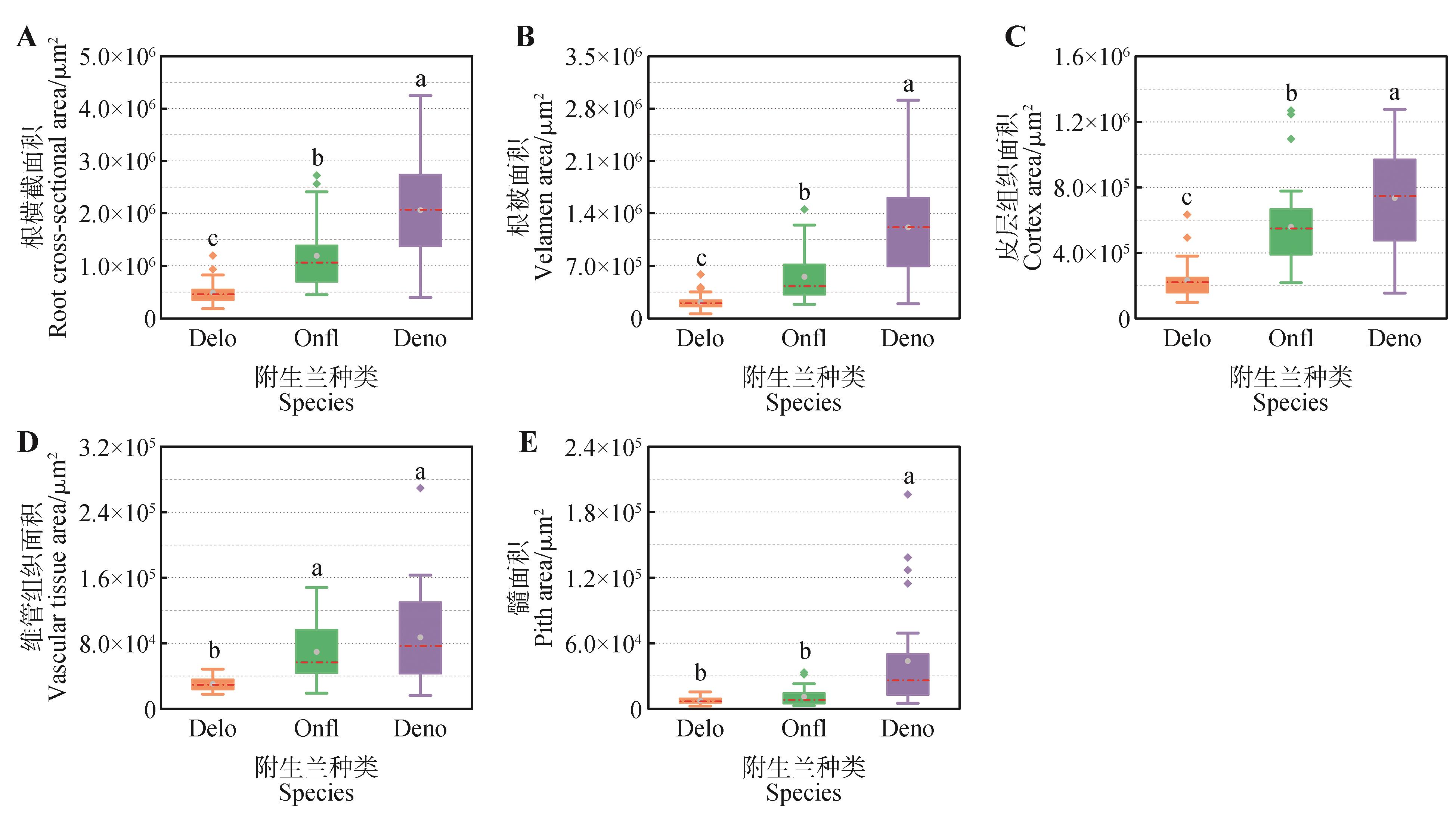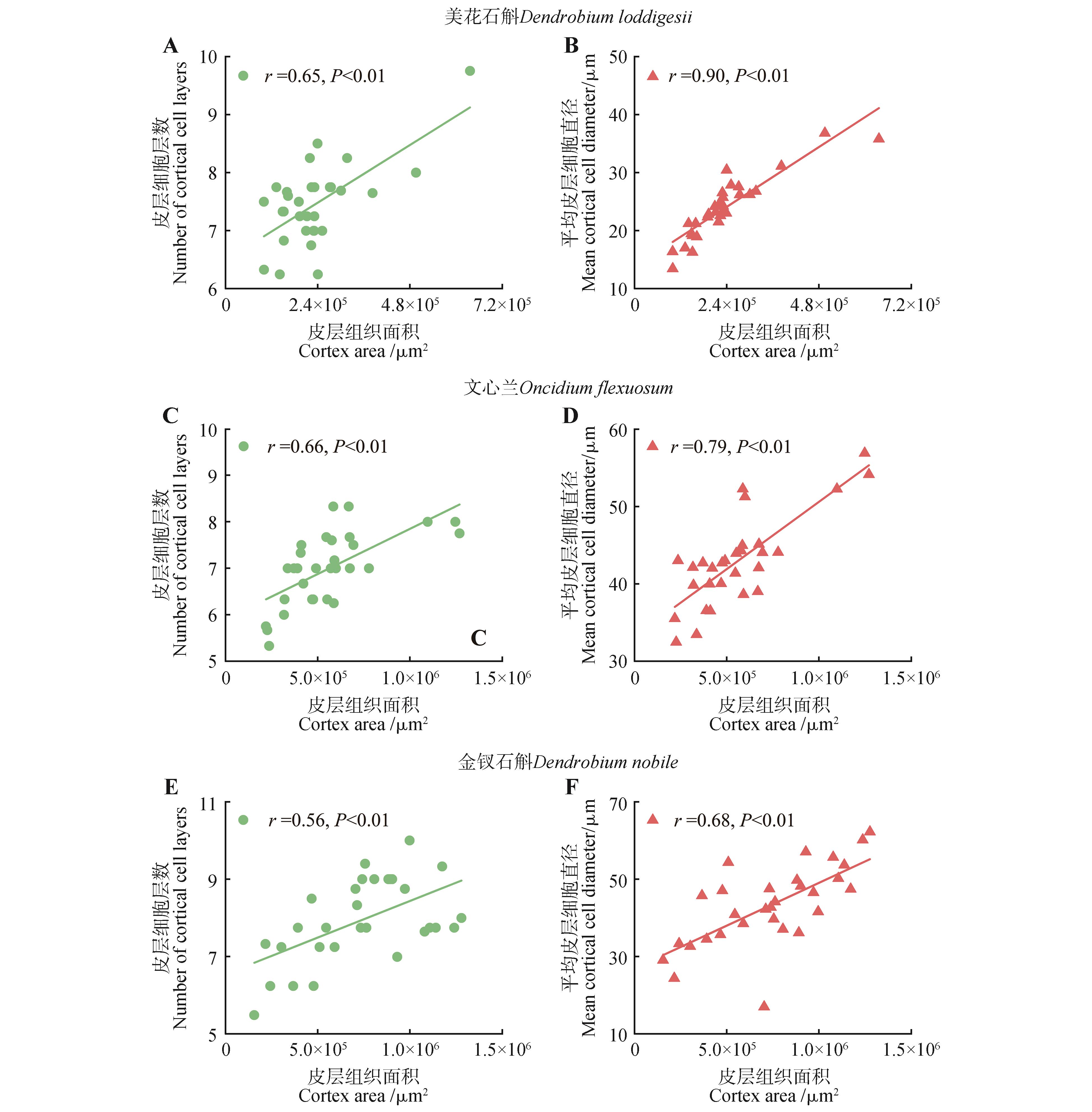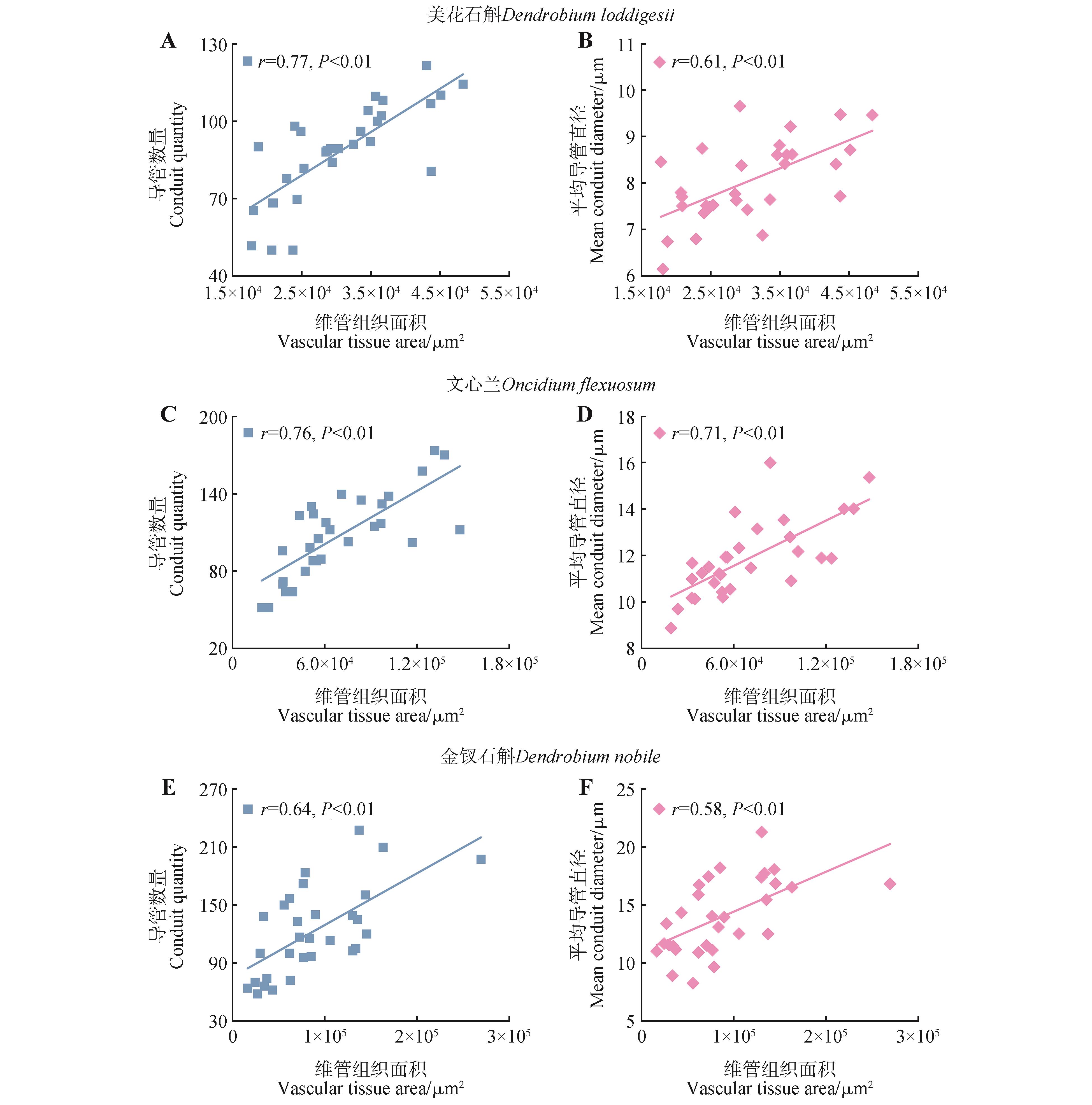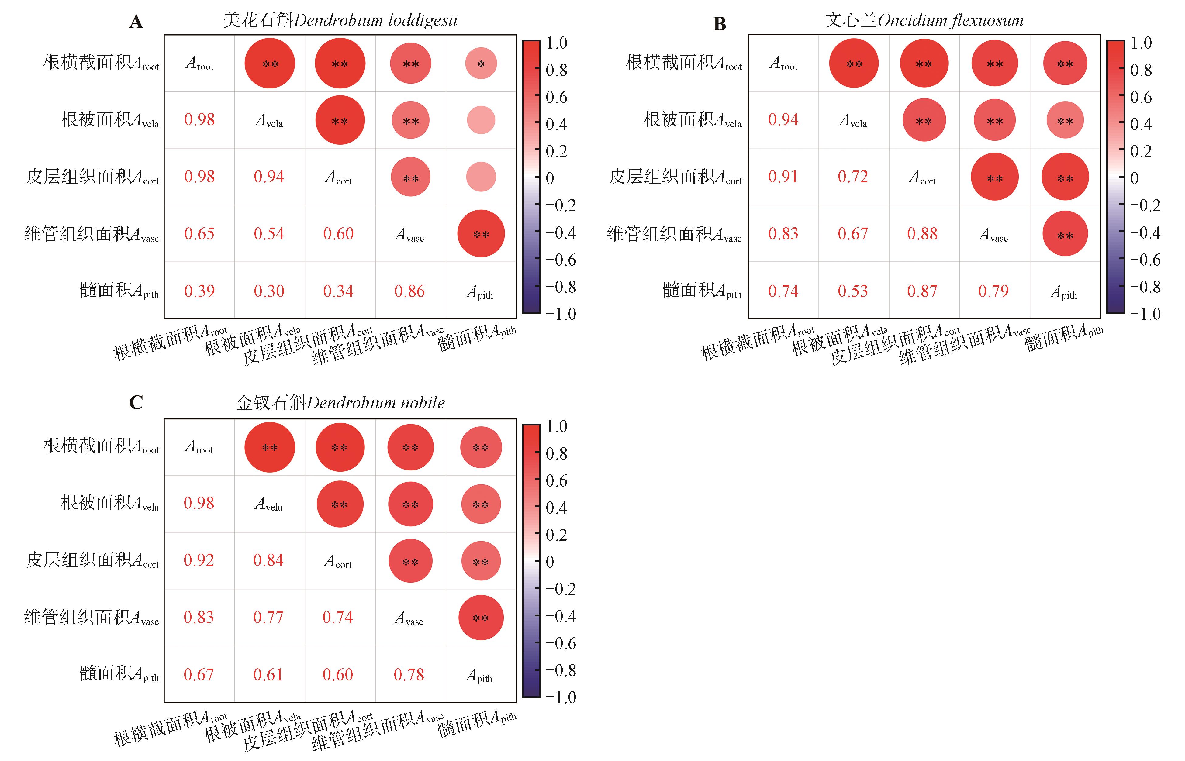 To understand the correlation between structure and function of aerial roots of epiphytic Orchidaceae plants, the paraffin embedding technique was used to obtain cross-sectional slices of the primary structures of aerial roots of Dendrobium loddigesiiOncidium flexuosum and Dendrobium nobile. By measuring the cross-sectional areas of cortical tissue, vascular tissue and other structures of the primary roots, as well as the characteristics such as the number and size of cortical cells and vessels, the anatomical reasons for cross-sectional area changes of the aerial roots were analyzed. The results indicated that: (1)there were significant differences in the cross-sectional area of aerial roots among three species(P<0.05), the cross-sectional area of the aerial root of D. nobile was the largest, followed by O. flexuosum and D. loddigesii. For each species, the proportions of velamen and cortex areas to the root cross-sectional area were relatively high(37.46%-57.03%), thus the velamen and cortex had high correlations with the root cross-sectional area(r=0.91-0.98,P<0.05). (2)Significant correlations existed between cortex area and cortical cell traits, vascular tissue area and conduit traits(P<0.05). The correlation of cortex area with the mean cortical cell diameter(r=0.68-0.90) was stronger than that with cortical cell layers(r=0.56-0.66). In addition, the correlation of vascular tissue area with conduit quantity(r=0.64-0.77) was closer than that with mean conduit diameter(r=0.58-0.71). (3)D. nobile had significantly lower proportions of cortical and vascular tissue area but a significantly higher proportion of velamen area to the root cross-sectional area, when compared to the other two species. Besides, D. nobile also had thicker and more conduits and larger total conduit area, but lower conduit density, which reflected the diversity of different epiphytic orchid species in resource acquisition and strategies for drought stress tolerance. In summary, this study clarified the anatomical mechanisms underlying the cross-sectional area changes of aerial roots of three epiphytic orchids as well as the interspecific differences in resource acquisition strategies, and provided a new scientific perspective for understanding the relationship between plant root structure and function.